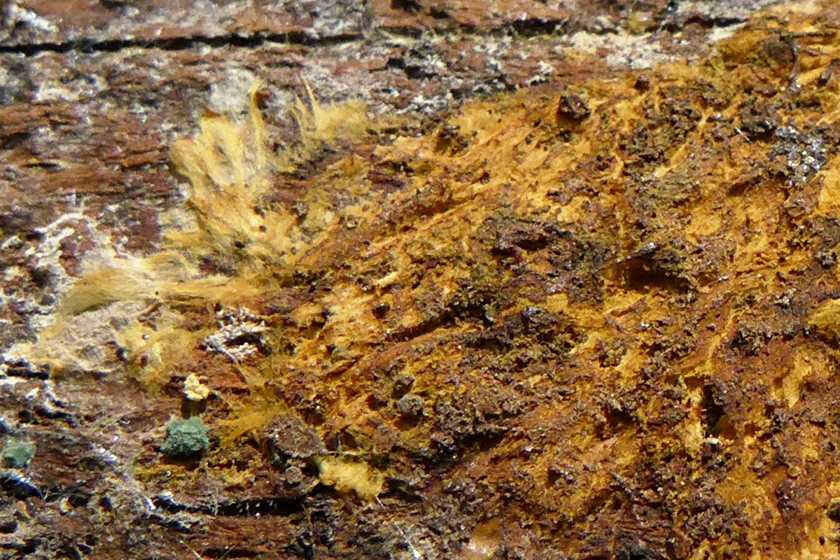 Fädige leuchtend gelbe "Fussel", es war auch ein bisschen "Belag mit Fusselrand" da (aber recht altersschwach und kaum definierbar, auf sehr morschem entrindeten cf. Laubholz).