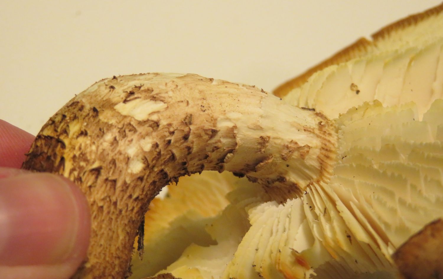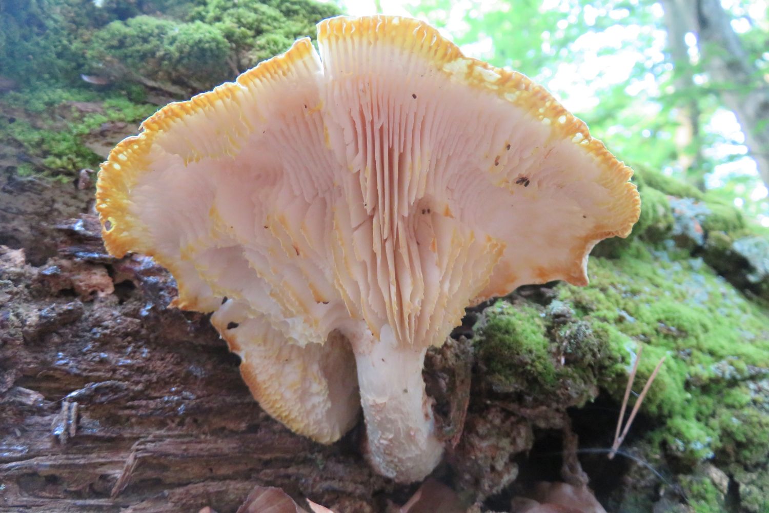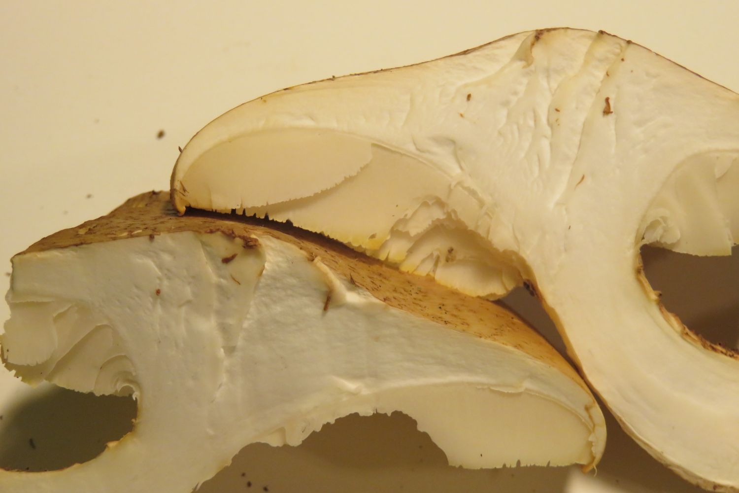 Stellenweise gibt es gelbe und orangene Verfärbung in Lamellen. Auf dem Schnittbild sieht man diese Farben auch am Stielbasis. Allerdings gibt es keine Verfärbung an der Schnittfläche, auch nach mehreren Stunden nicht.