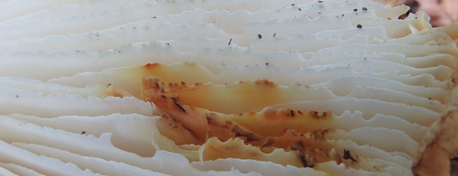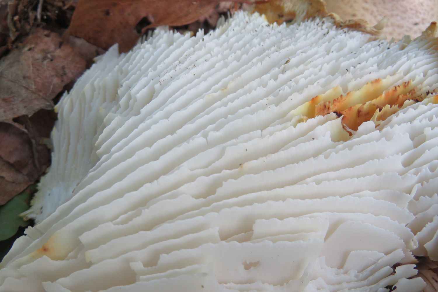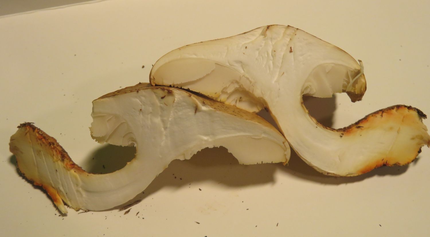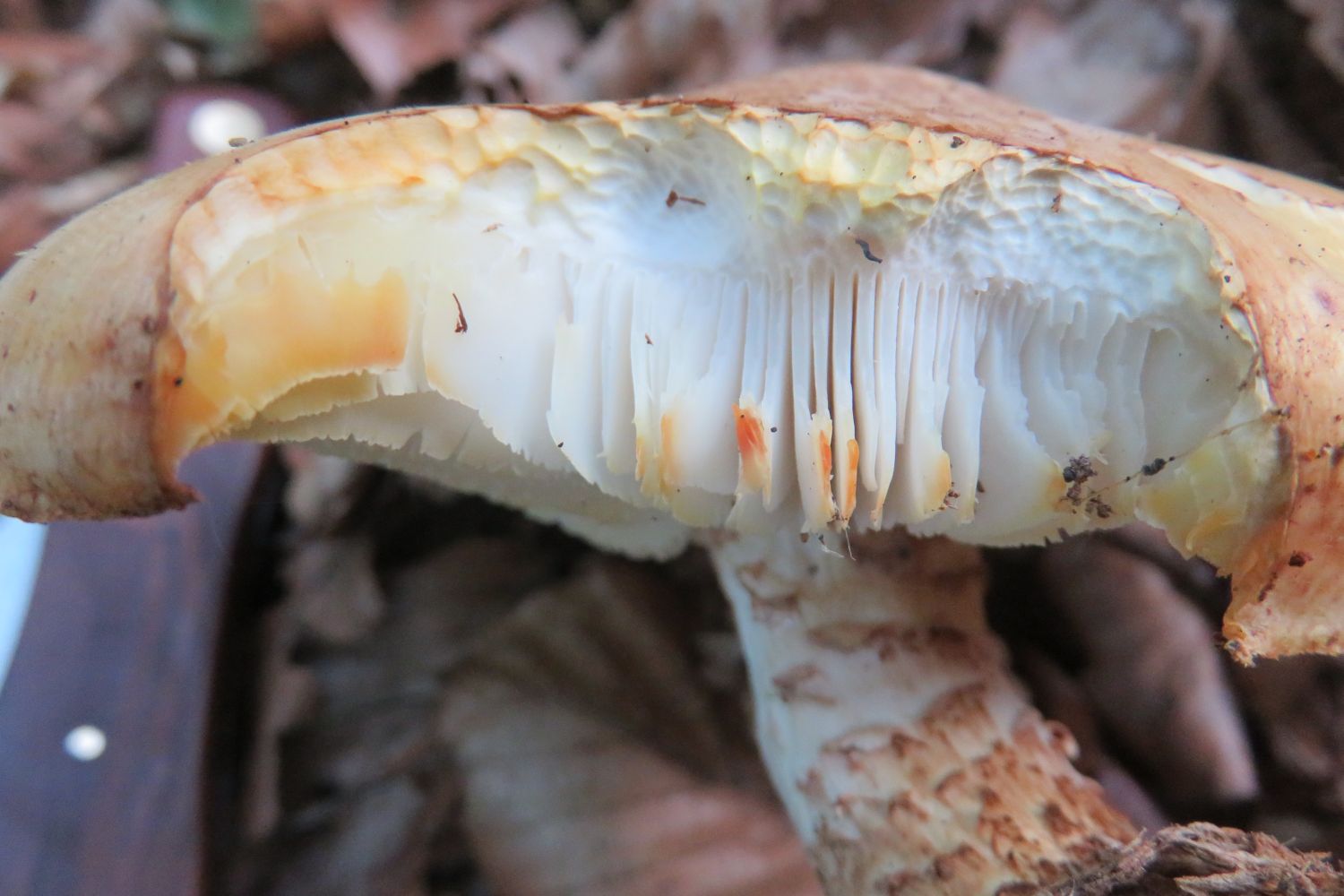 Stellenweise gibt es gelbe und orangene Verfärbung in Lamellen. Auf dem Schnittbild sieht man diese Farben auch am Stielbasis. Allerdings gibt es keine Verfärbung an der Schnittfläche, auch nach mehreren Stunden nicht.