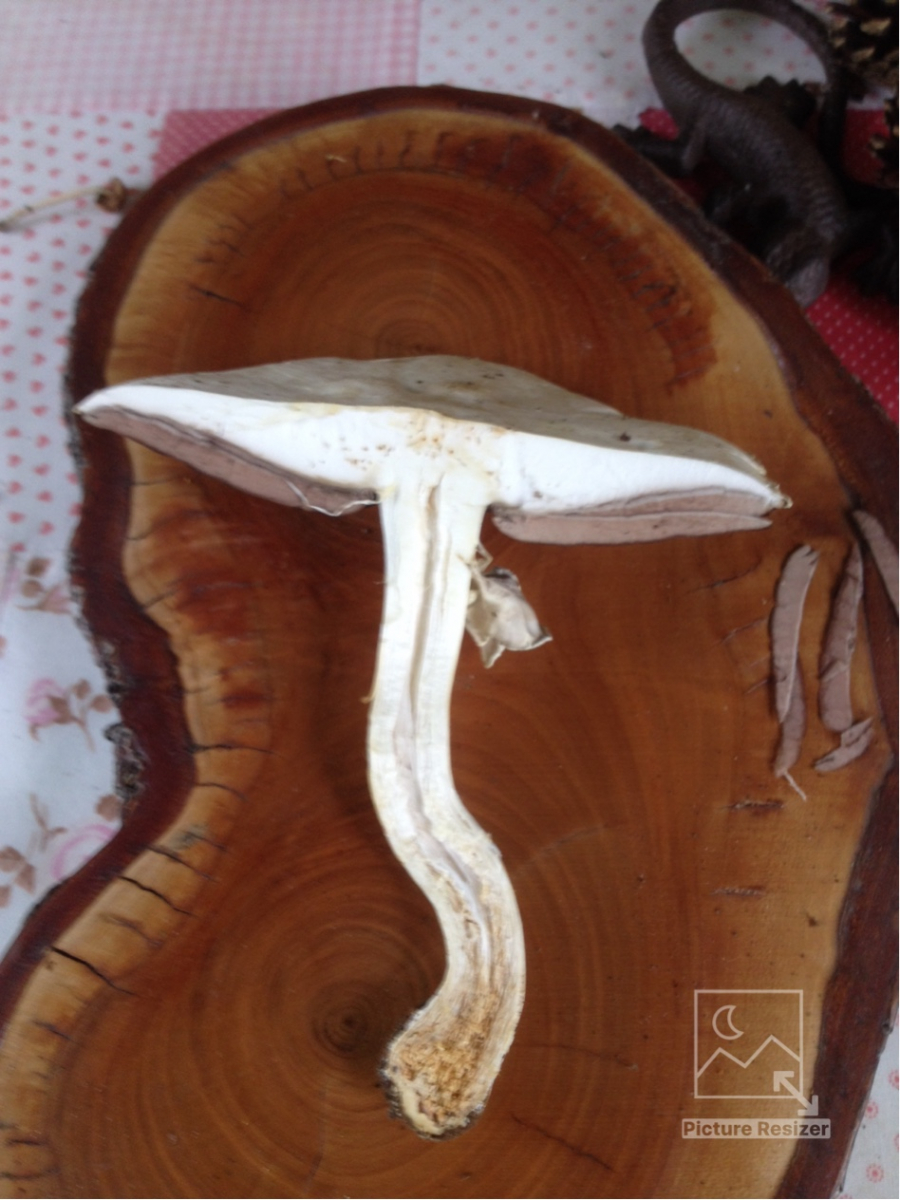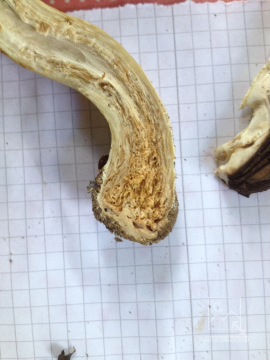Stiel: Länge ca. 15cm, dm 1,5 - 2cm, Farbe wie Hut, mit gelblichem Anflug, faserig, innen hohl/wattig gefüllt, Basis leicht knollig, deutliche, lappige Velumreste, ließ sich leicht aus dem Hut "knacken"