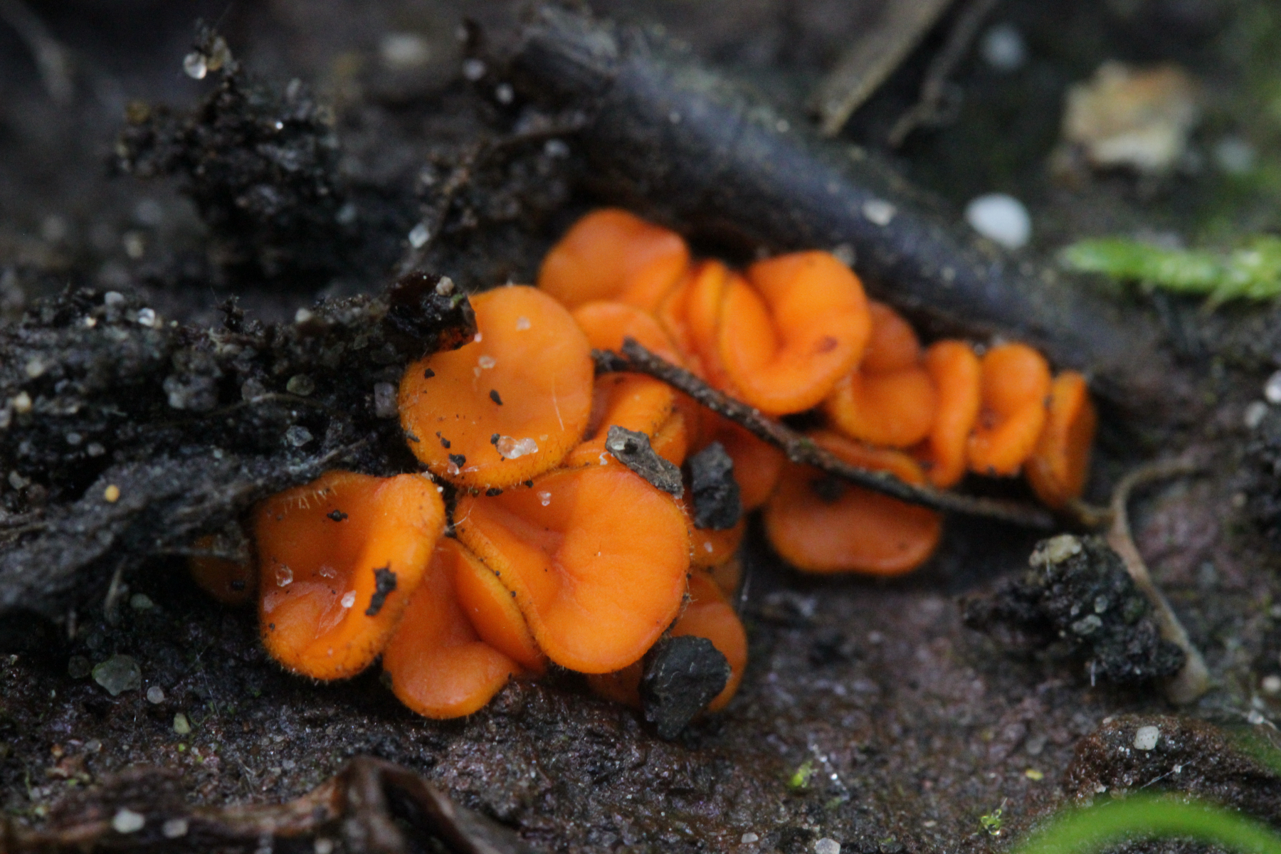 2.) Scutellinia sp. auf dem Boden wachsend.