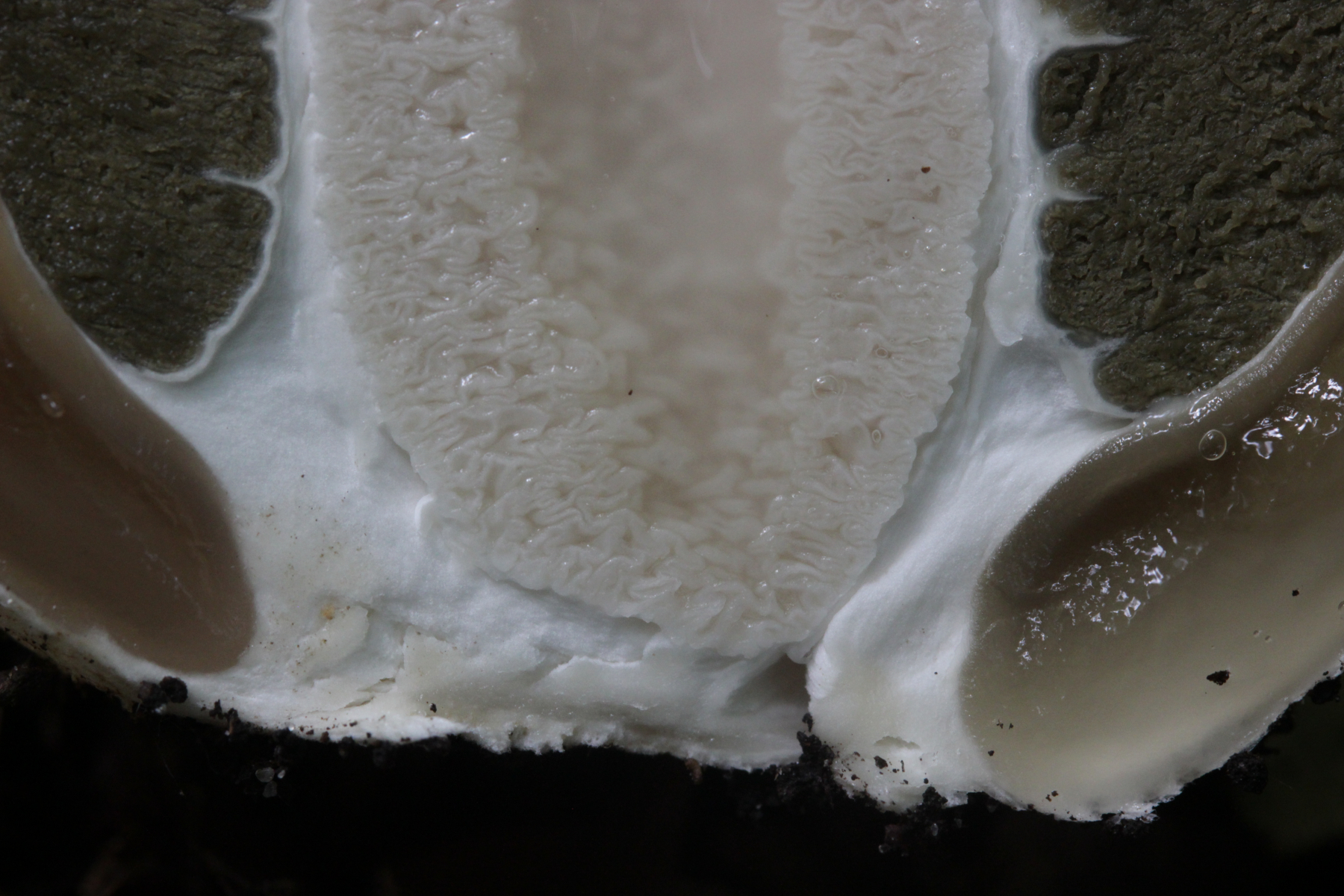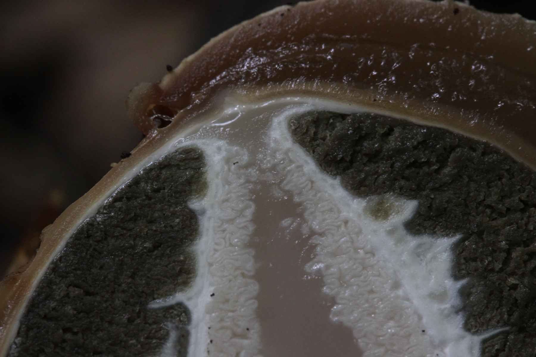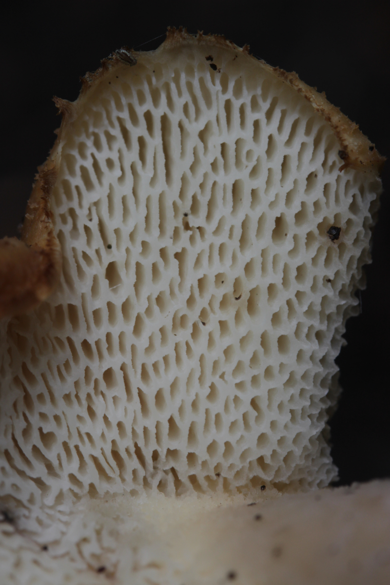 Xerocomus venenatus: Fleisch weich, oft schon wabbelig von den Huträndern her, durchlöchert, farblich unbefriedigend, oft ausßen mit weißlichen Flecken und Belägen versehen.