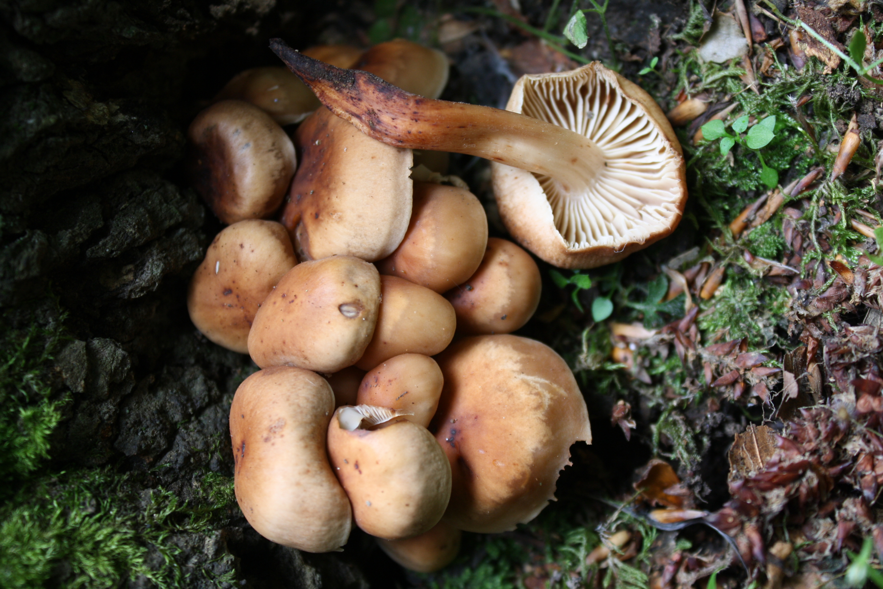 Hut:ausgewachsene Einzelhüte in großen Büscheln meist um 4-8 cm im Durchmesser, einzeln stehende Exemplare auch größer; Hutoberfläche immer glatt (nie samtig, filzig, haarig), jung und / oder feucht speckig und glänzend; gerne etwas runzlig / radialfaltig (kann auch fehlen); Hutrand lange herabgebogen; Huthaut etwas hygrophan, dunkel rotbraun bis weiß; mit starker Tendenz, braune Flecken zu entwickeln, und das gelegentlich auch schon recht früh.