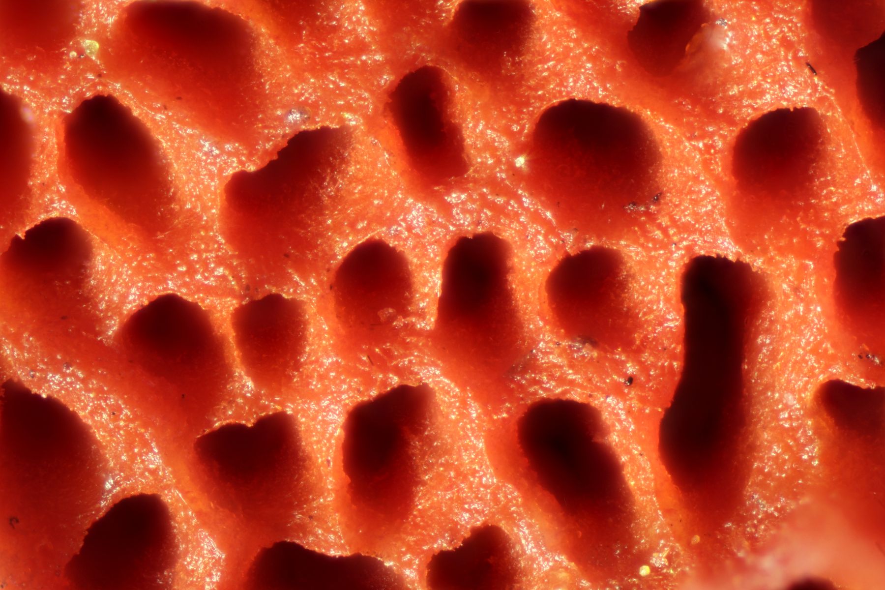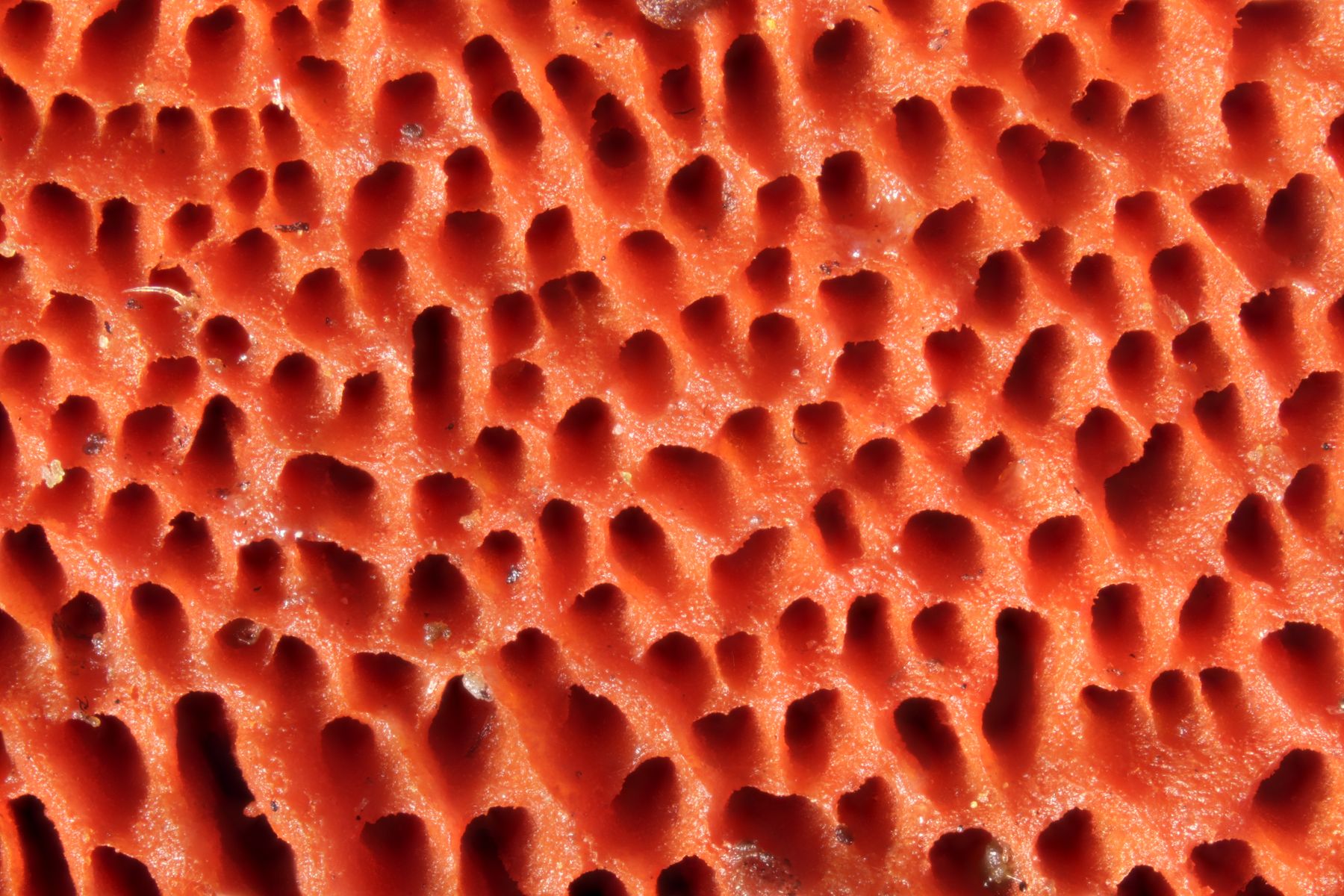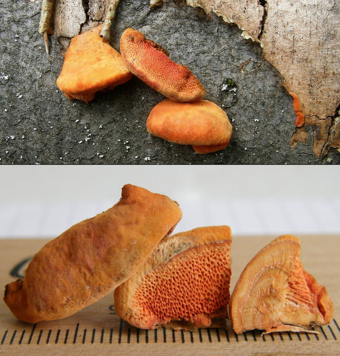 makroskopische Eigenschaften: Fruchtkörper einzeln bis dachziegelig –“ verwachsen; ungestielt aber normalerweise deutlich pileat, höchstens an Substratunterseiten oder schräg überhängendem Substrat mit kleineren Resupinatanteilen; anfangs knubbelig, bald mit ausgebreiteten, aber recht dickfleischigen Hüten, im Schnitt meist dreieckig; Hutkanten jung abgerundet, später auch scharf; im Wachstum oft mit einer fein filzigen, sterilen Zuwachszone am Hutrand; Konsistenz fest und zähfleischig, getrocknet hart; Hutoberfläche feinfilzig, vor allem frisch, im Alter von der Ansatzstelle her verkahlend und dann vor allem feucht glatt und glänzig; oft ziemlich uneben auswachsend mit allerlei chaotisch verlaufenden Runzeln, Grübchen und Huckelchen, manchmal auch mit einzelnen, konzentrischen Zonierungen; anfangs leuchtend orangerot gefärbt bis satt zinnoberrot, im Alter ockerlich ausblassend; Poren meist noch intensiver gefärbt, vor allem bei älteren Exemplaren vom Zentrum her blutrot, um 2-4/mm; Fleisch +/- zoniert; zähfaserig; orange, orangeocker bis orangerot; Geruch und Geschmack unspezifisch; Hutoberseite reagiert mit KOH 5% dunkel graubraun bis schwarz.