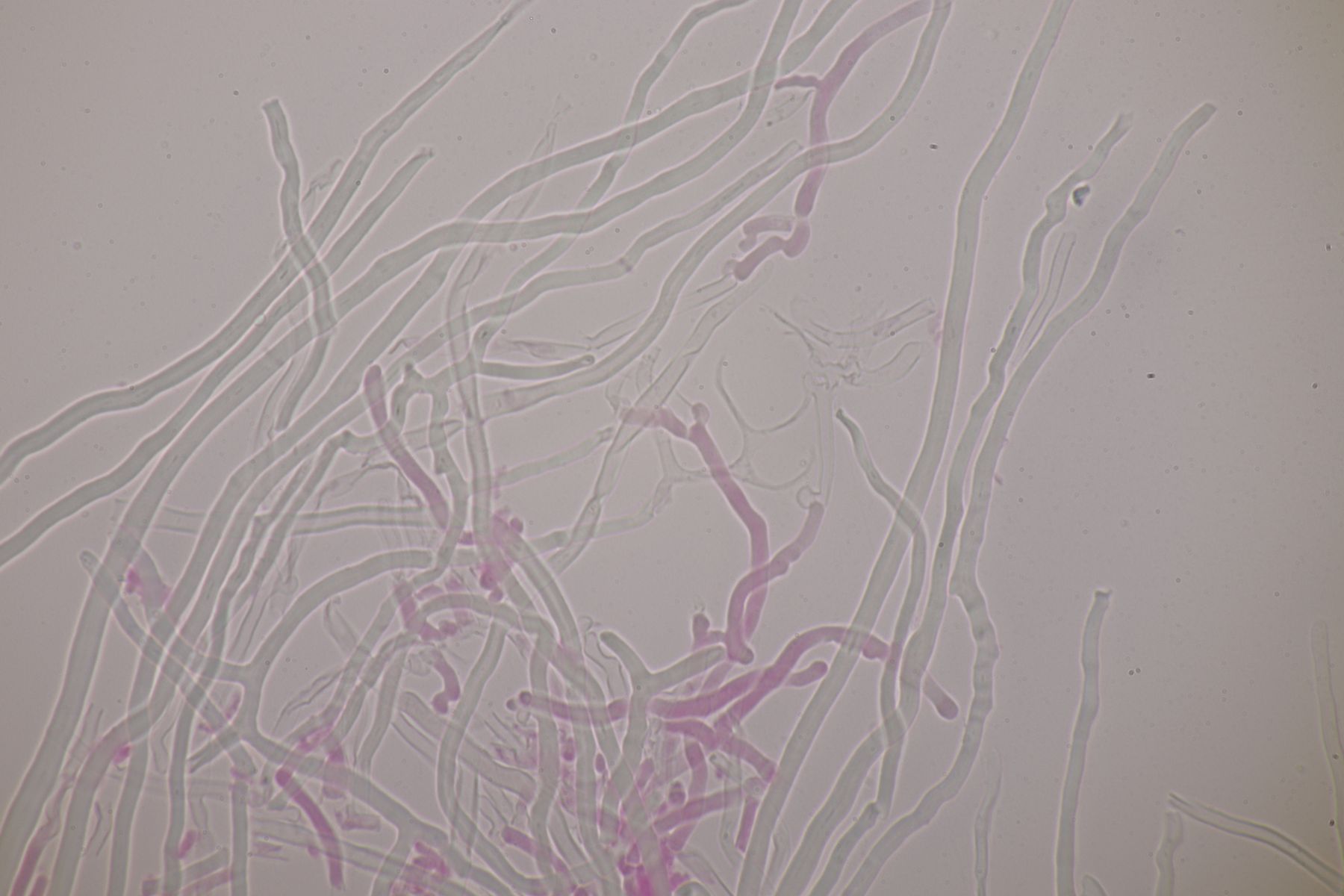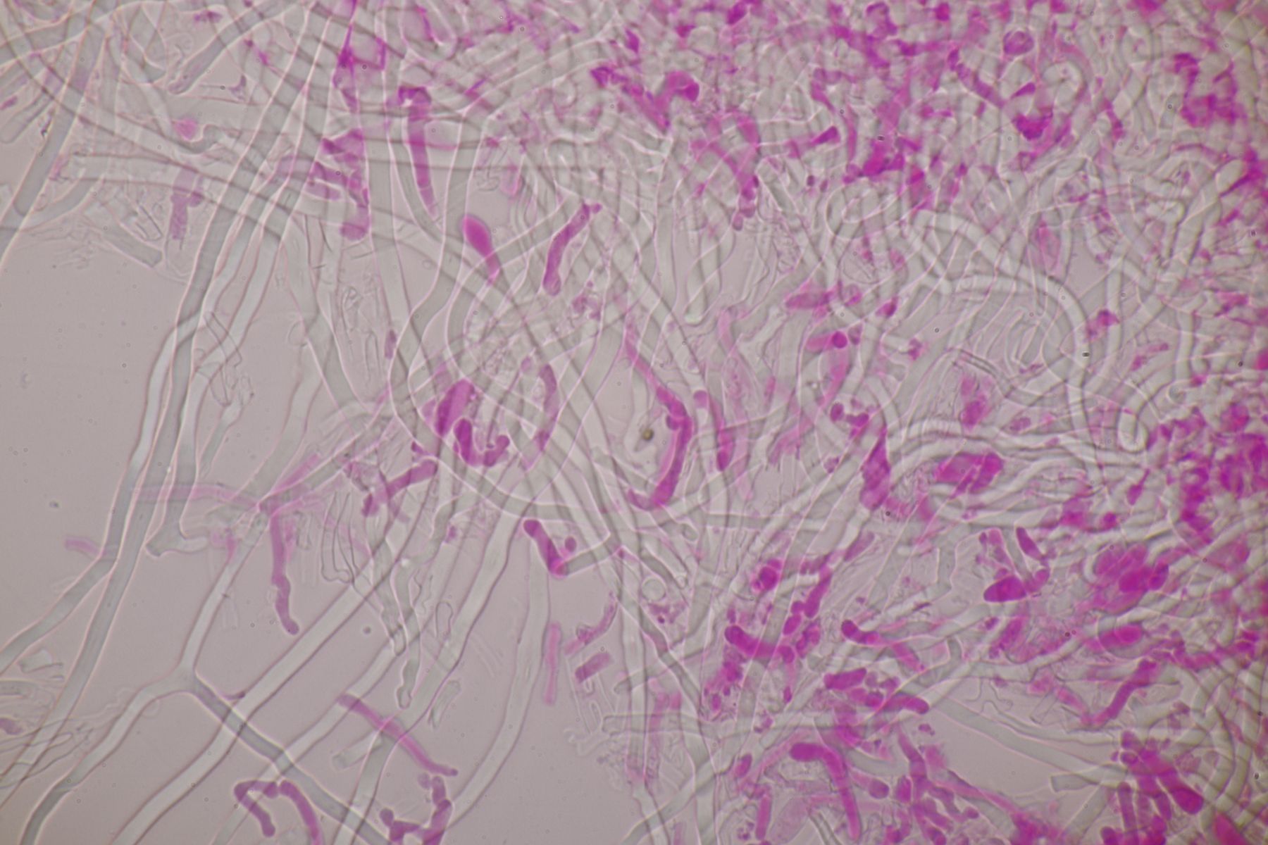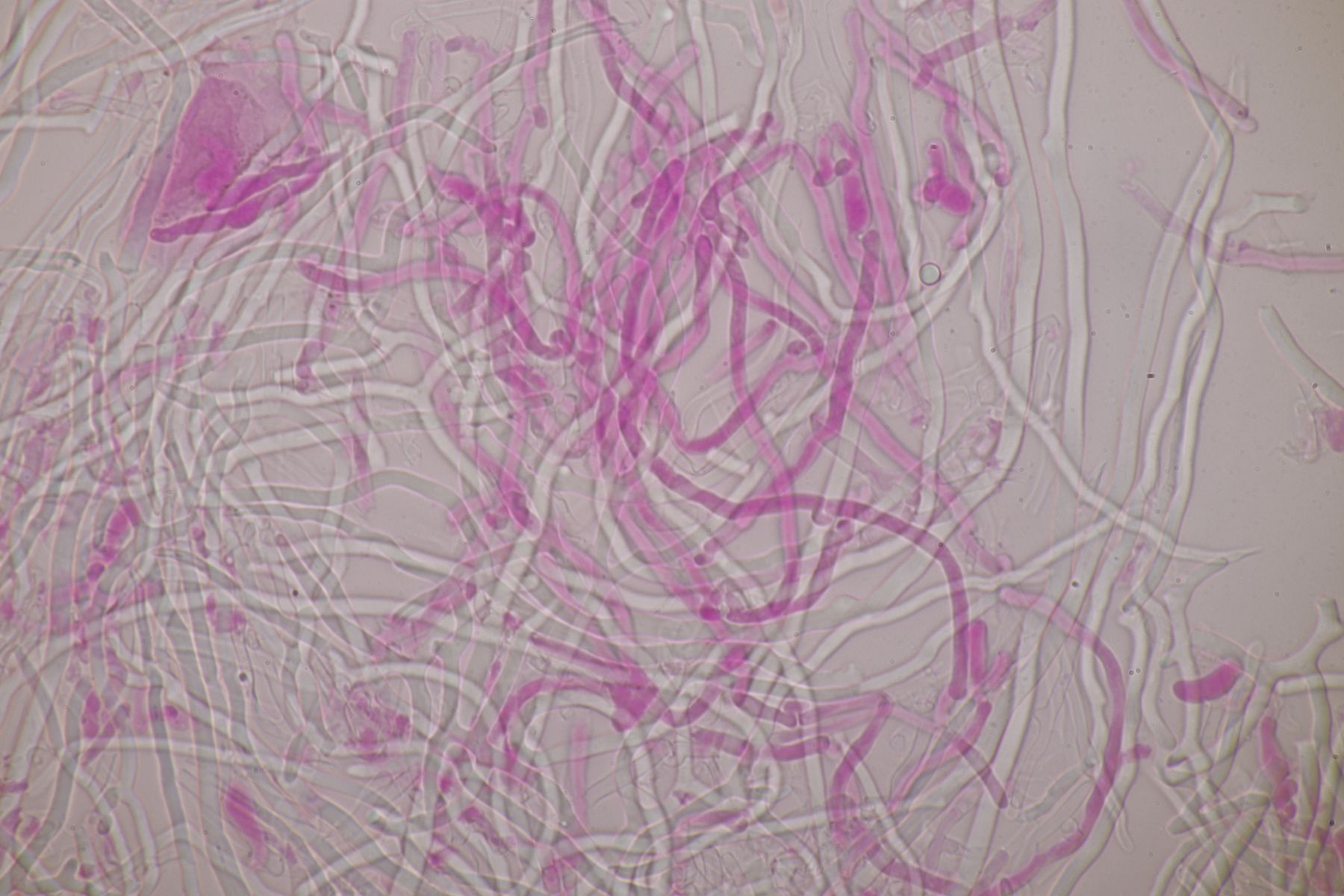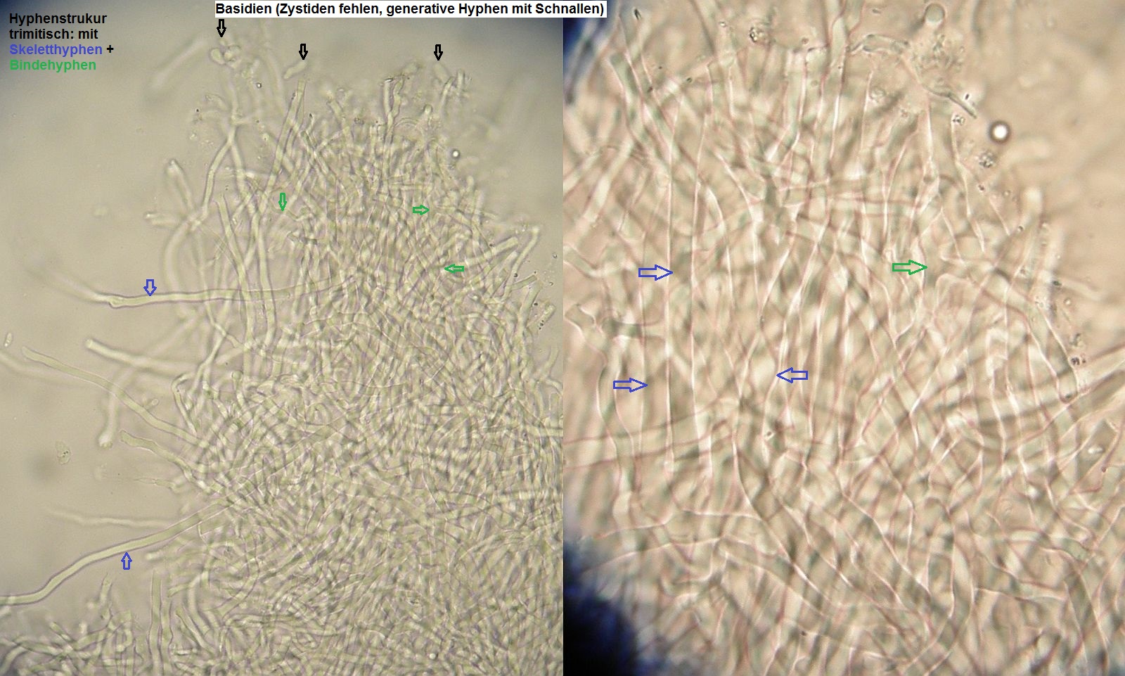 mikroskopische Eigenschaften: Hyphenstruktur trimitisch; generative Hyphen teils schwer zu beobachten, hyalin, dünnwandig, Septen mit Schnallen; Skeletthyphen dickwandig, unseptiert, kaum verzweigt; Bindehyphen etwas schmaler, ebenfalls dickwandig, reich verzweigt; Hymenium ohne Zystiden, Basidien keulig (2-)4-sporig, mit Basalschnalle; Sporen glatt, dünnwandig, inamyloid, elliptisch, bei reifen Fruchtkörpern um 5,5-7 x 2-3 µm, Sporen von unreifen Fruchtkörpern auch aus Abwurfpräparaten können abweichen (siehe unten).