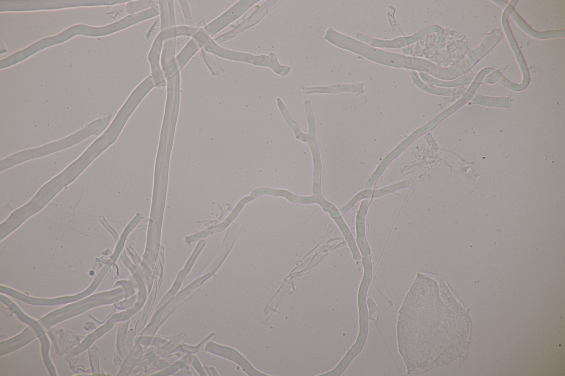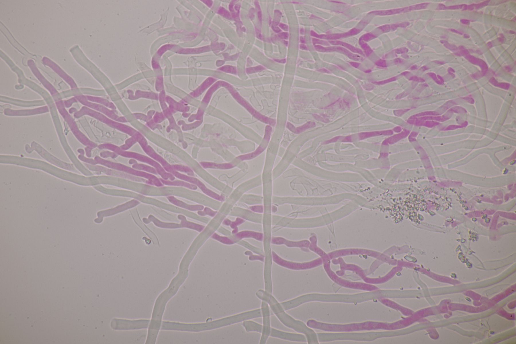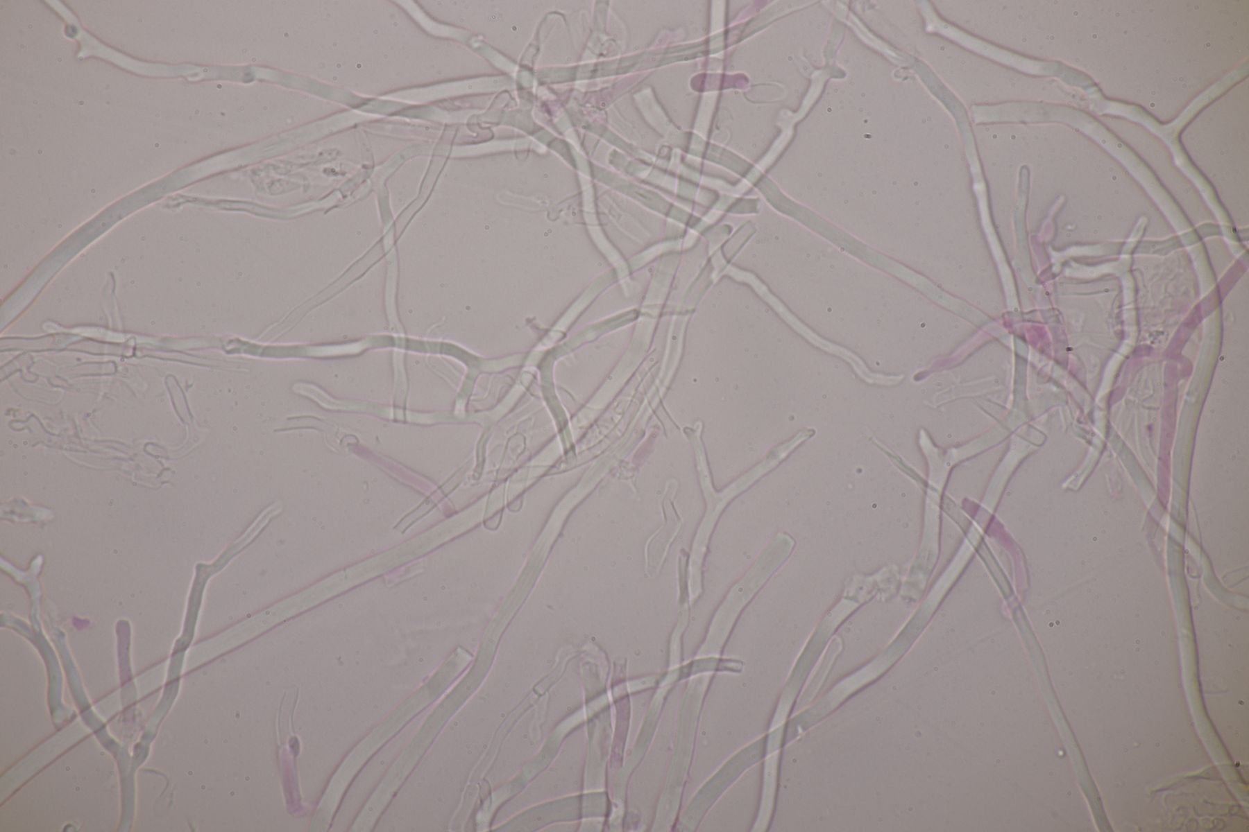 mikroskopische Eigenschaften: Hyphenstruktur trimitisch; generative Hyphen teils schwer zu beobachten, hyalin, dünnwandig, Septen mit Schnallen; Skeletthyphen dickwandig, unseptiert, kaum verzweigt; Bindehyphen etwas schmaler, ebenfalls dickwandig, reich verzweigt; Hymenium ohne Zystiden, Basidien keulig (2-)4-sporig, mit Basalschnalle; Sporen glatt, dünnwandig, inamyloid, elliptisch, bei reifen Fruchtkörpern um 5,5-7 x 2-3 µm, Sporen von unreifen Fruchtkörpern auch aus Abwurfpräparaten können abweichen (siehe unten).