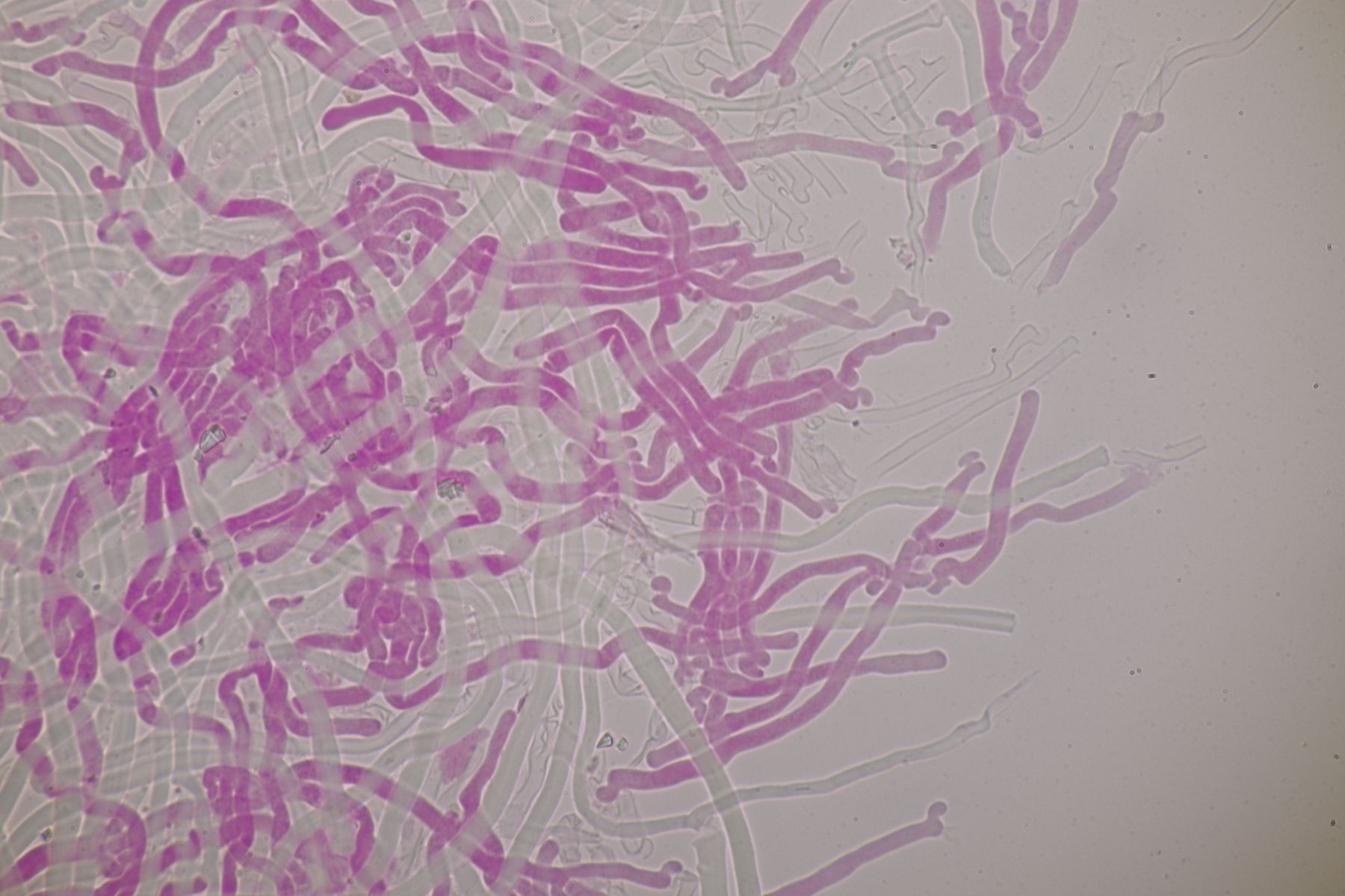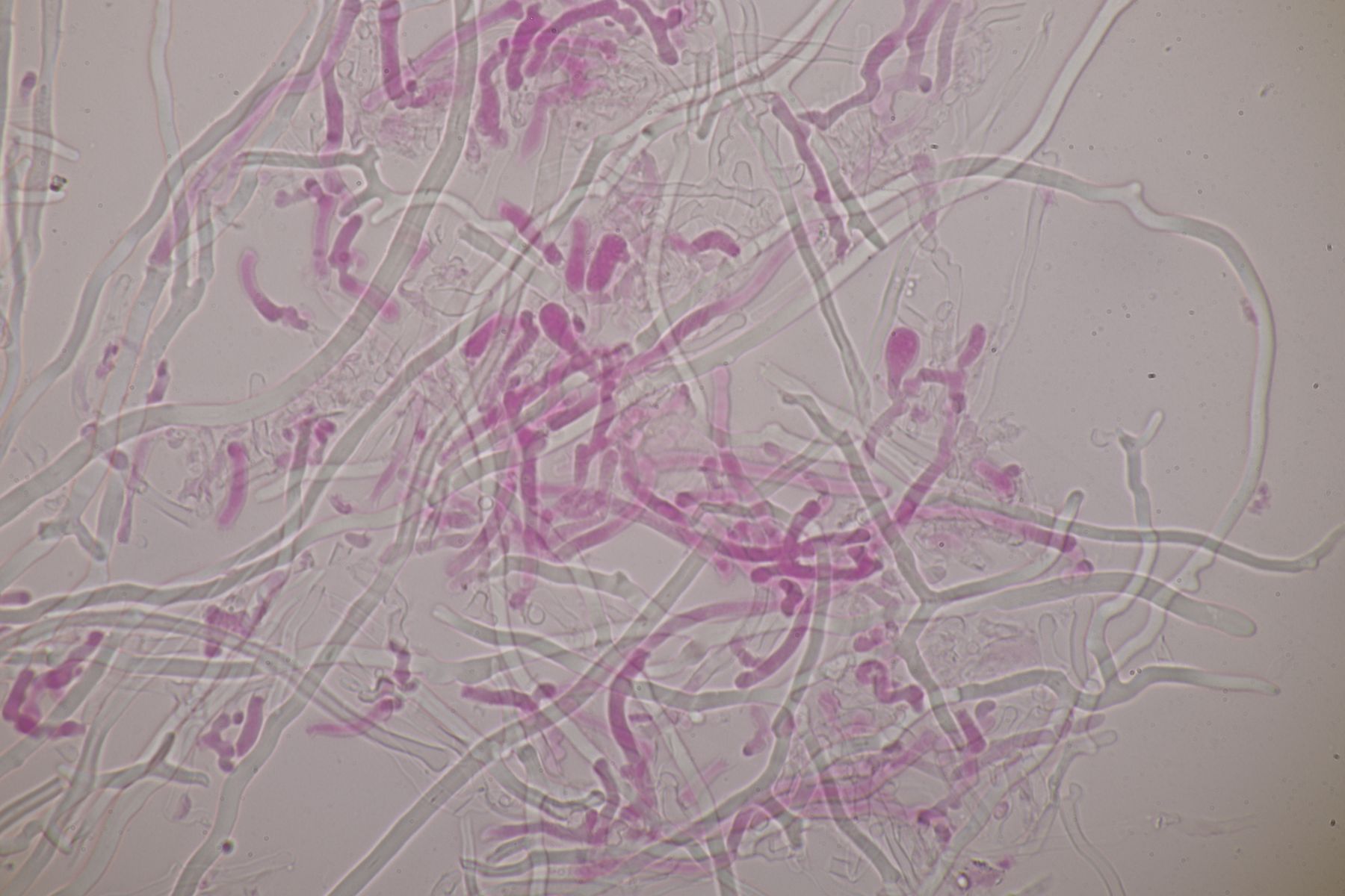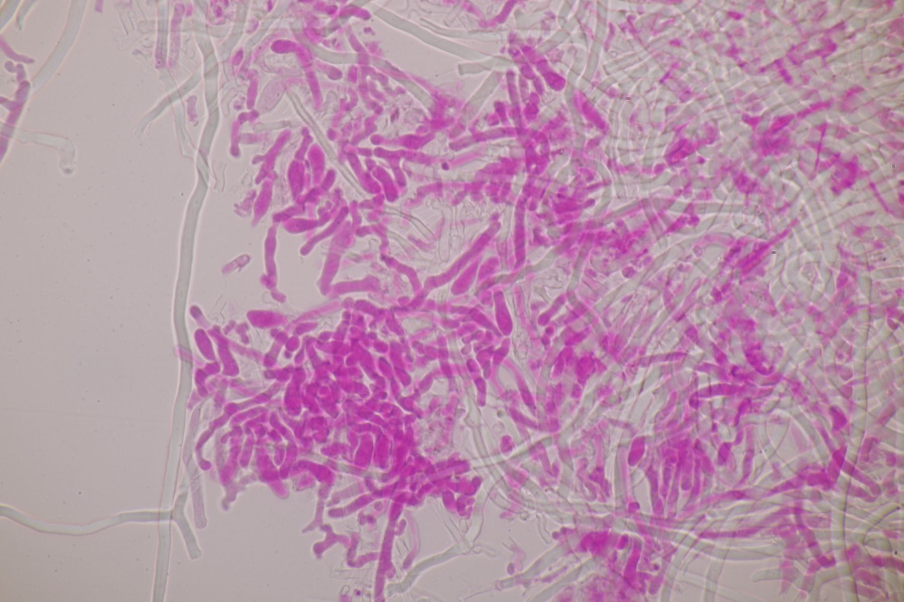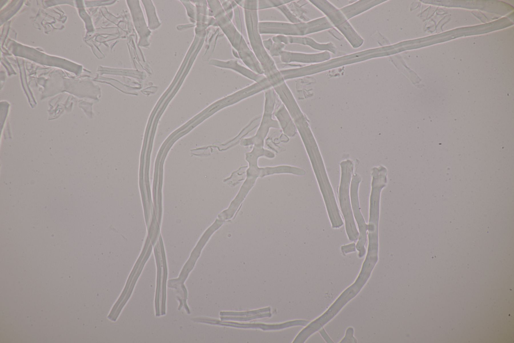 mikroskopische Eigenschaften: Hyphenstruktur trimitisch; generative Hyphen teils schwer zu beobachten, hyalin, dünnwandig, Septen mit Schnallen; Skeletthyphen dickwandig, unseptiert, kaum verzweigt; Bindehyphen etwas schmaler, ebenfalls dickwandig, reich verzweigt; Hymenium ohne Zystiden, Basidien keulig (2-)4-sporig, mit Basalschnalle; Sporen glatt, dünnwandig, inamyloid, elliptisch, bei reifen Fruchtkörpern um 5,5-7 x 2-3 µm, Sporen von unreifen Fruchtkörpern auch aus Abwurfpräparaten können abweichen (siehe unten).