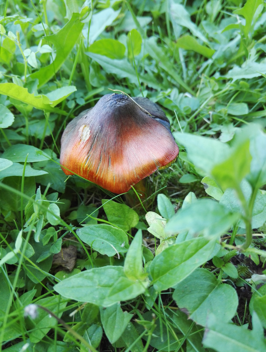 mit ziemlicher Sicherheit der Schwärzende Saftling, Hygrocybe conica. Mein frühester Fund = 28.05.2006 auf einem Friedhof.