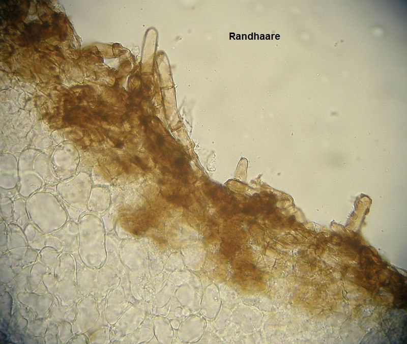 mikroskopische Eigenschaften: Randhaare und Flankenhaare braun pigmentiert, apikal abgerundet, +/- dickwandig und vorwiegend anliegend; Asci 8-sporig, operculat, ohne Reaktion auf Melzer oder Lugol; Paraphysen apikal keulig, mit karotinoidem Pigment gefüllt (verfärbt sich in Lugol grün); Sporen ohne Ornament um 14-18 x 7-9 µm (mit Ornament bis 22 µm lang!); besetzt mit dicken Warzen, die durch ein grobes, oft unvollständig sichtbares Netz verknüpft sind; an den Sporenpolen geht das Ornament in dickere Anhängsel über (Sporen apikulat).