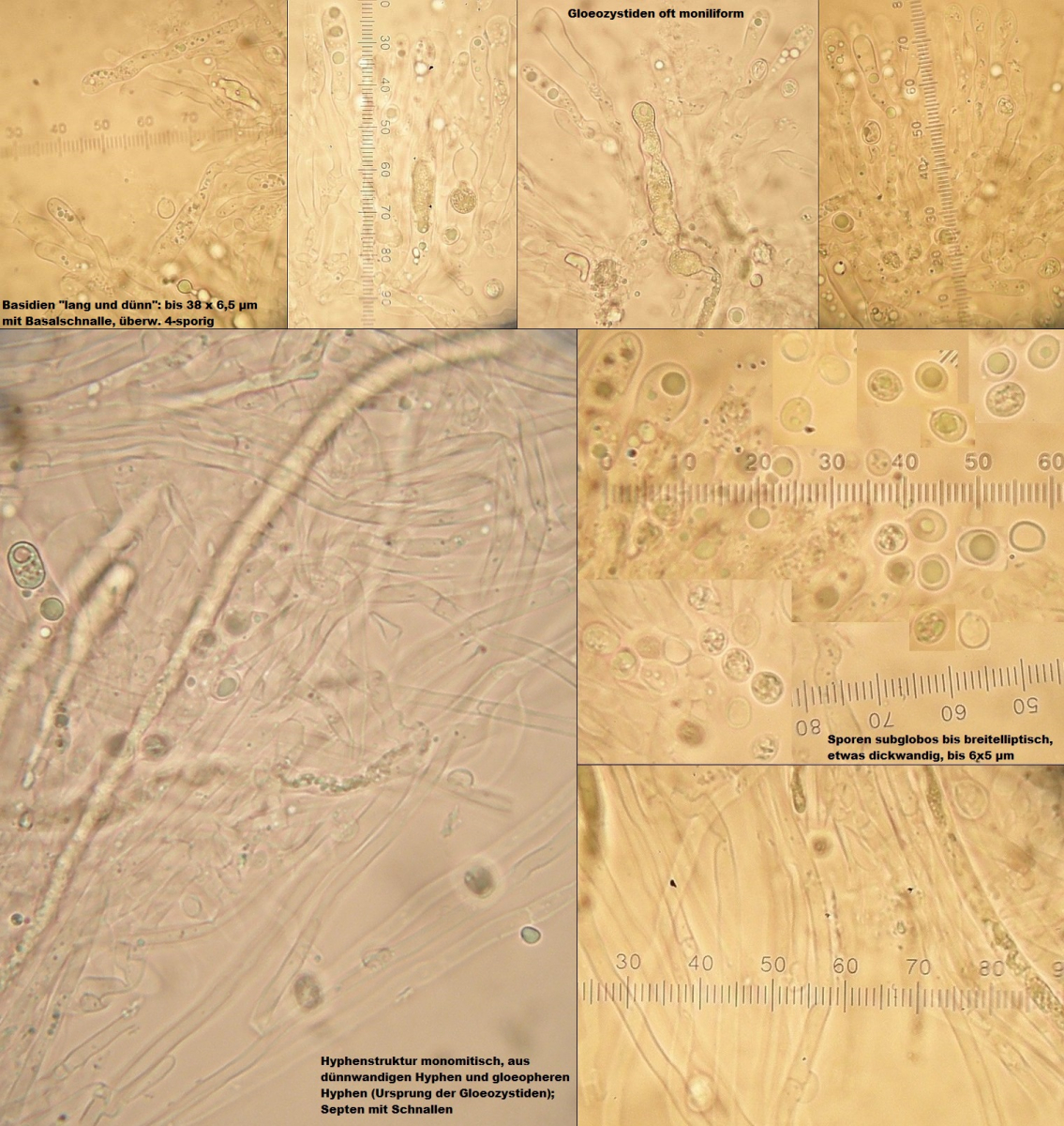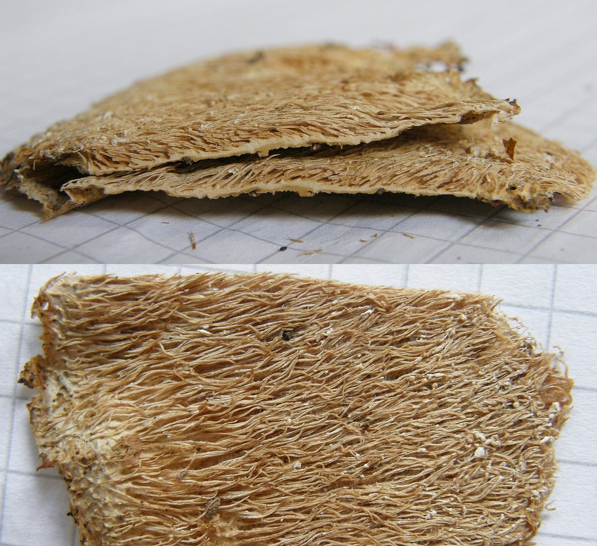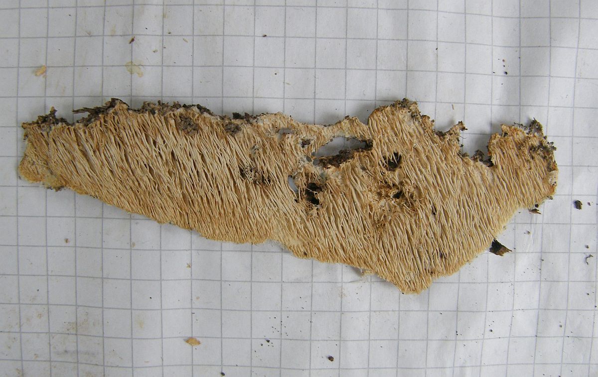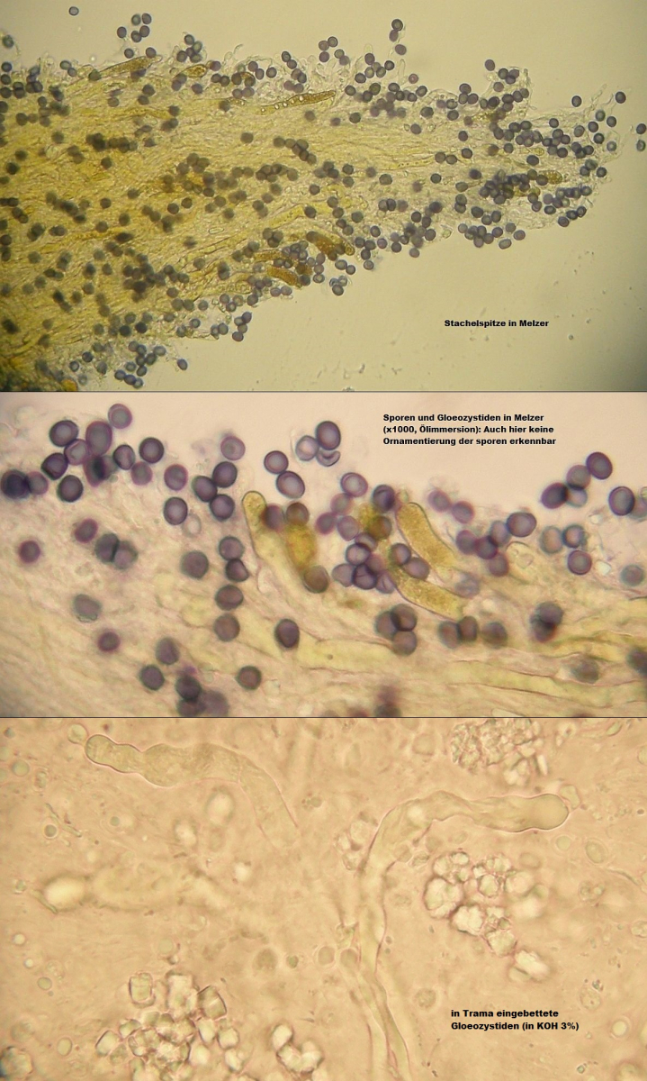 makroskopische Eigenschaften: Ausbilung von einjährigen, resupinaten Fruchtkörpern die das Substrat häutig überziehen, dünne Fruchtschicht mit ca 2cm langen, spitz zulaufenden Zähnen. Läßt sich am Stück vom Substrat lösen, obwohl nur sehr dünn relativ zäh, nur leicht pilziger Geruch, keine Verfärbungen auf Druck erkennbar