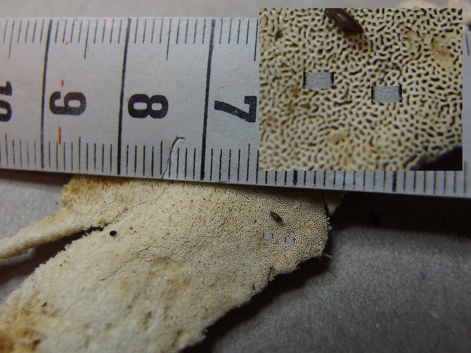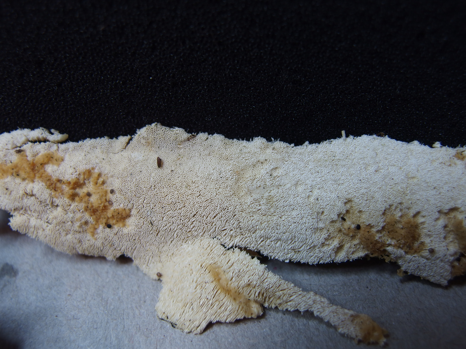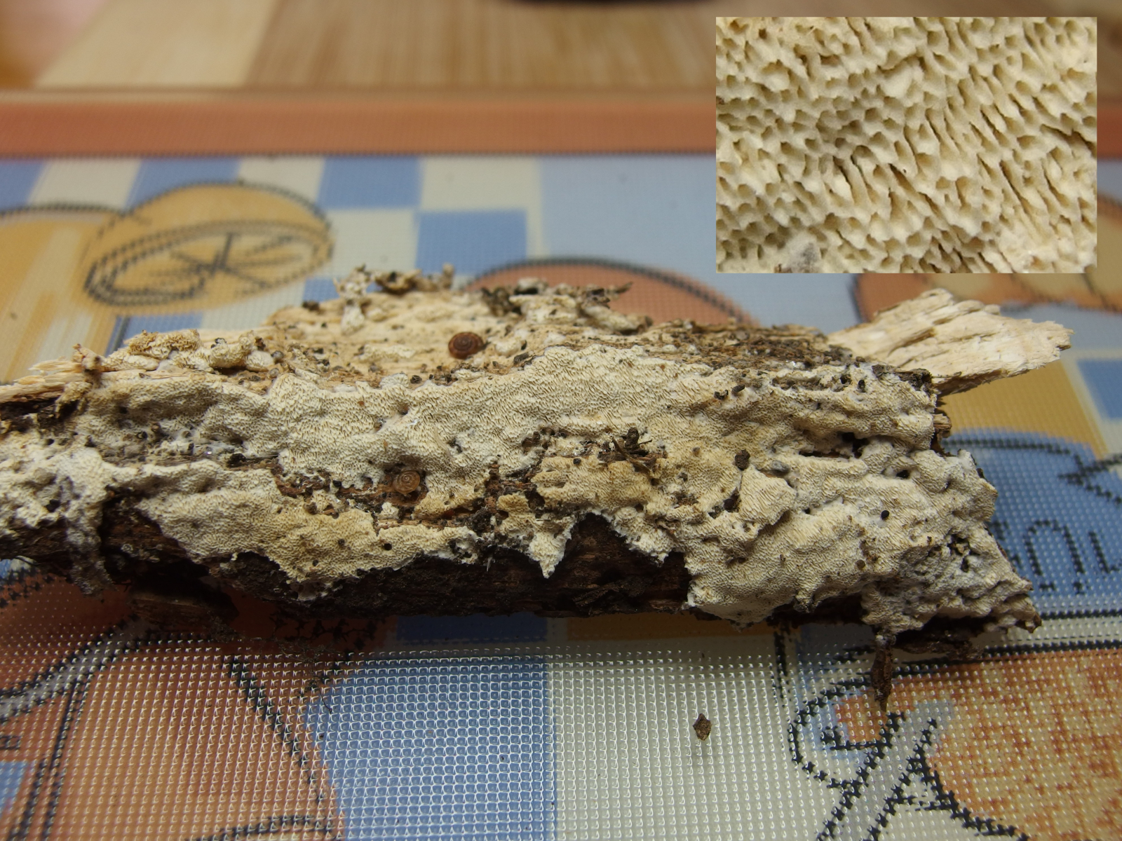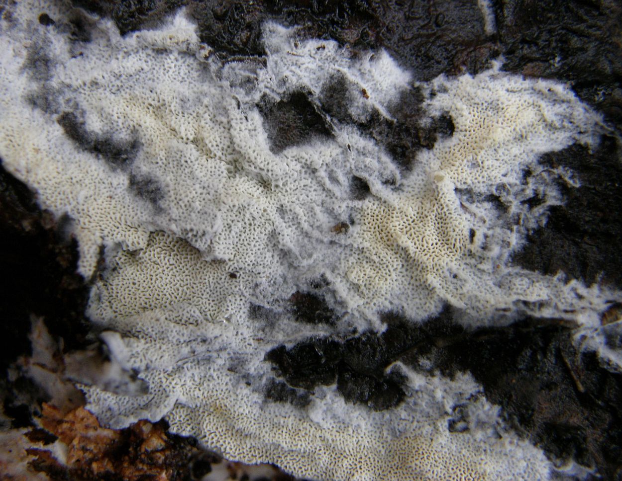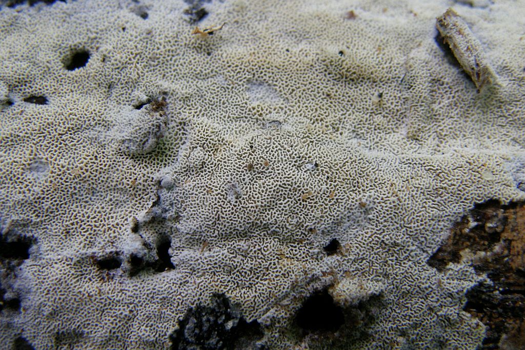 Weil resupinate, helle Porlinge gibt's halt wie Sand am Meer. Nur so als Beispiel: Wenn Junghuhnia lacera mal keine Rhizomorphen ausbildet, ist sie makroskopisch nicht mehr von Schizopora radula zu unterscheiden. Junghuhnia nitida ist von Schizopora flavipora makroskopisch nicht wirklich abgrenzbar (auch Porengrößen überlappen da stark), und das ist wirklich nur mal ein spontanes Zufallsbeispiel.