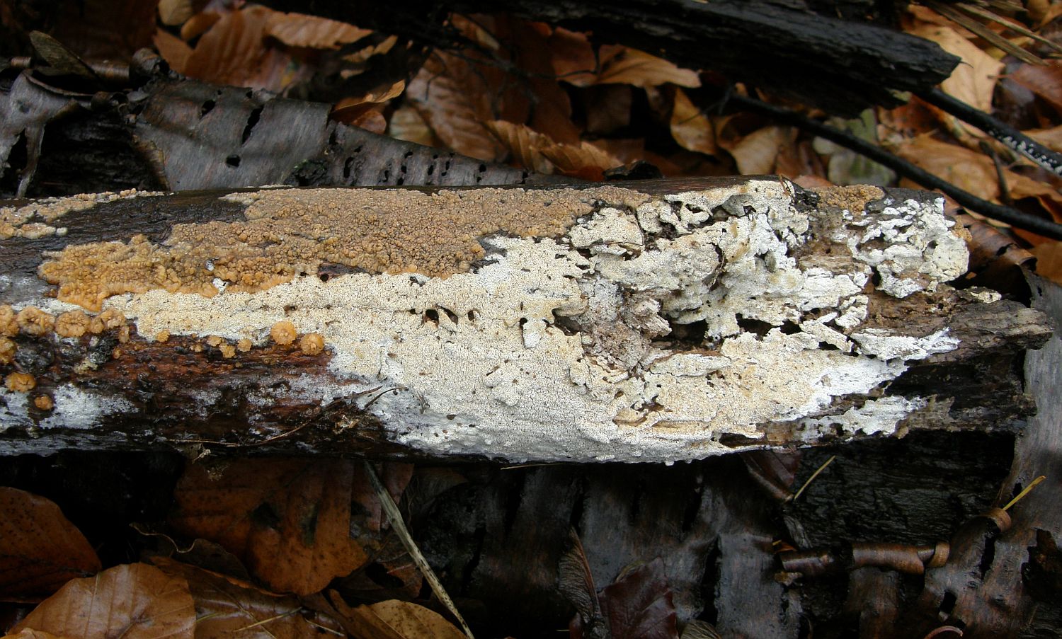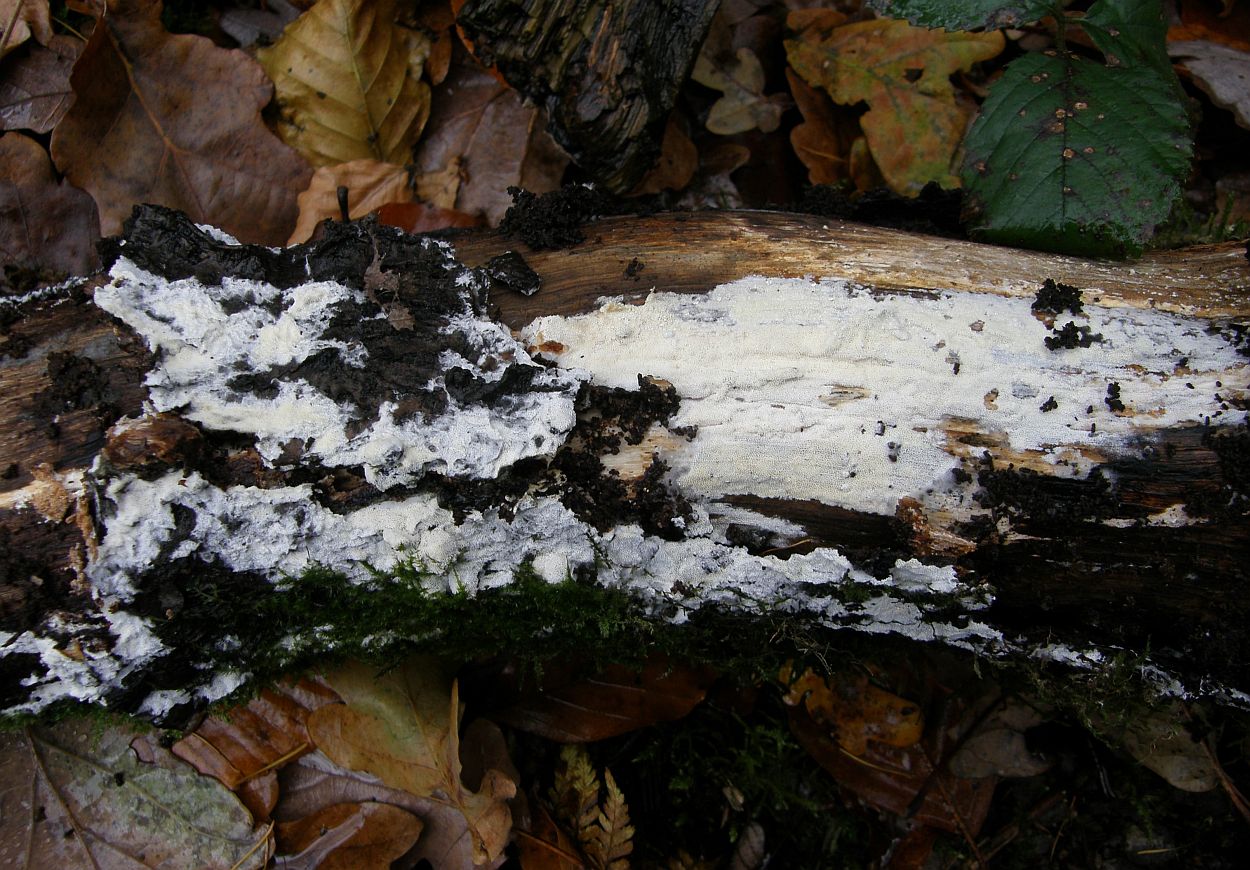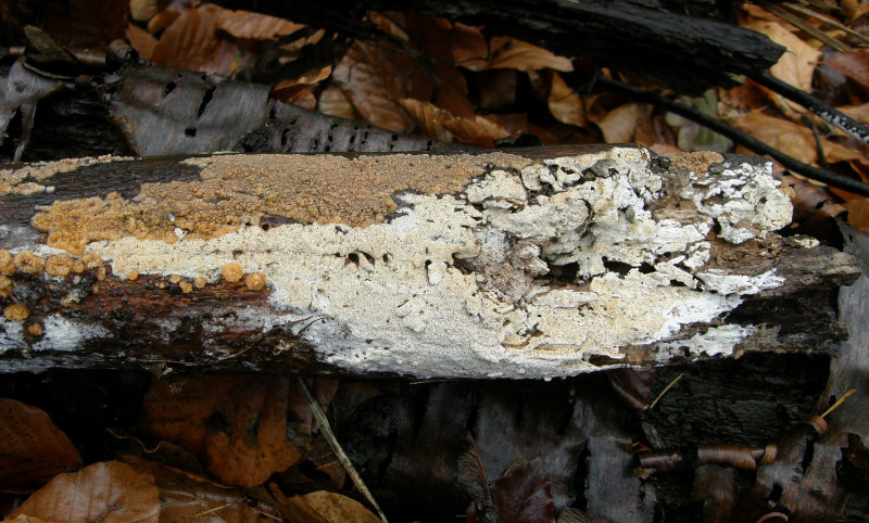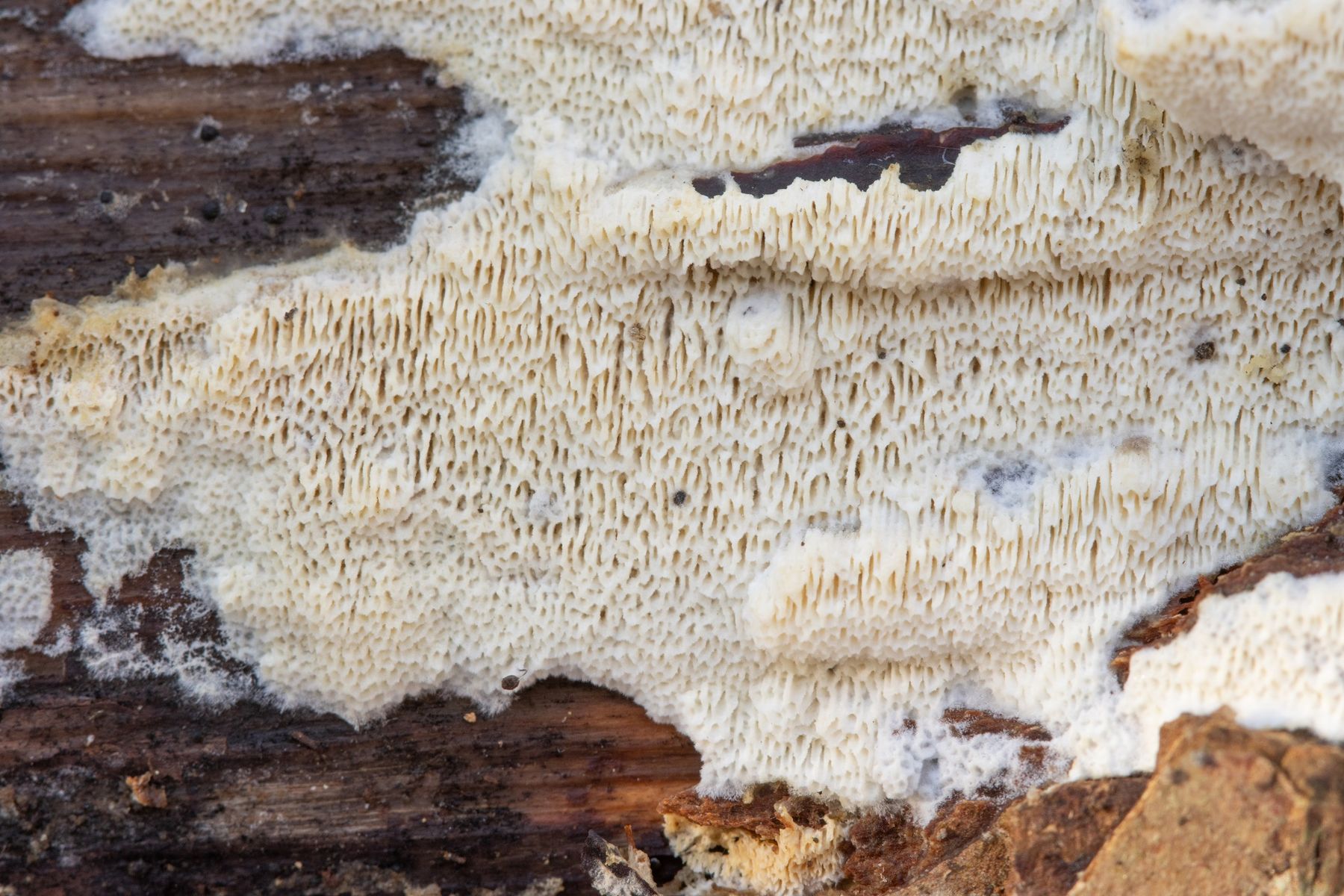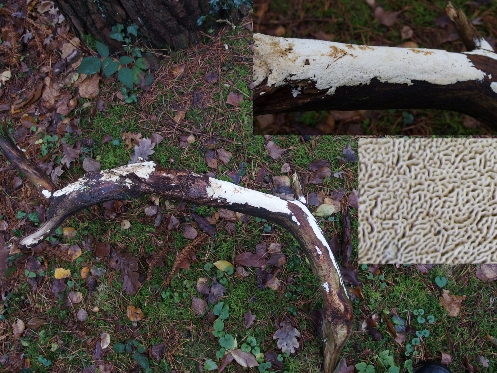 Weil resupinate, helle Porlinge gibt's halt wie Sand am Meer. Nur so als Beispiel: Wenn Junghuhnia lacera mal keine Rhizomorphen ausbildet, ist sie makroskopisch nicht mehr von Schizopora radula zu unterscheiden. Junghuhnia nitida ist von Schizopora flavipora makroskopisch nicht wirklich abgrenzbar (auch Porengrößen überlappen da stark), und das ist wirklich nur mal ein spontanes Zufallsbeispiel.