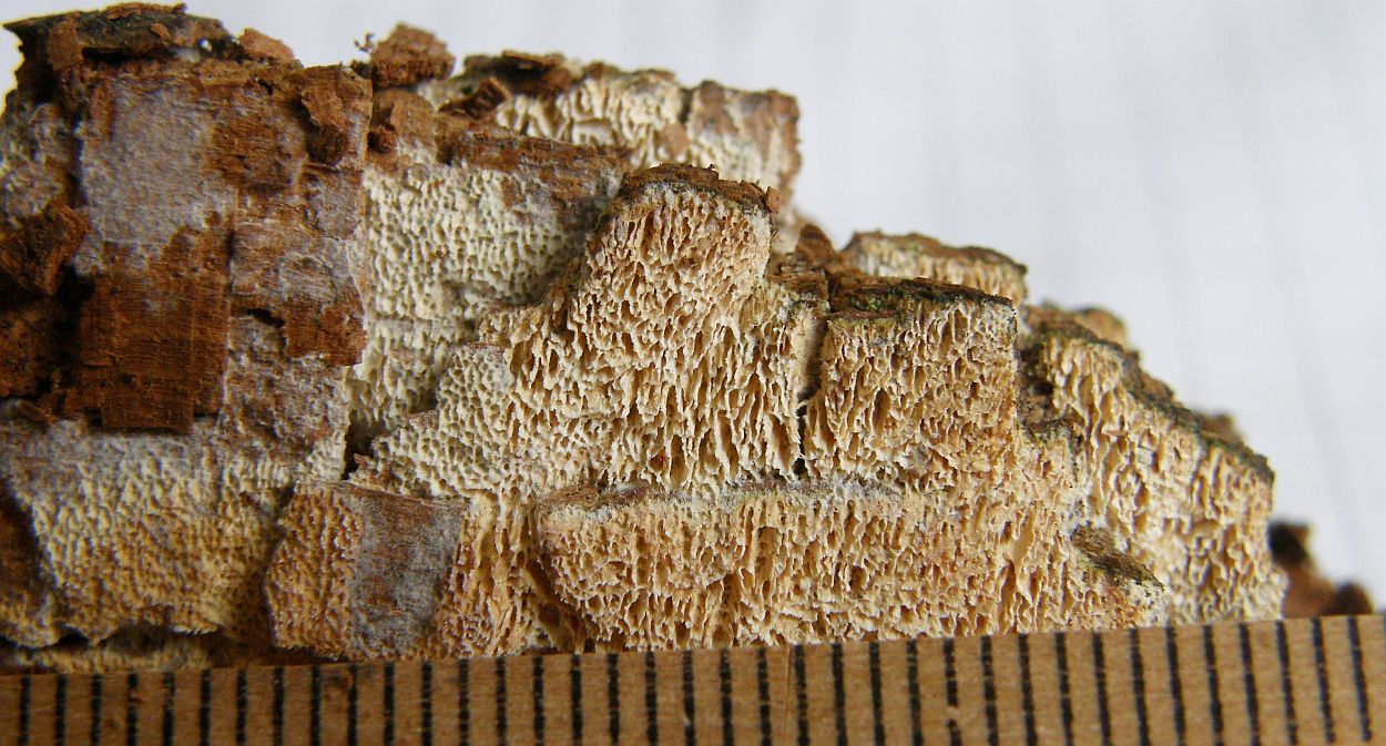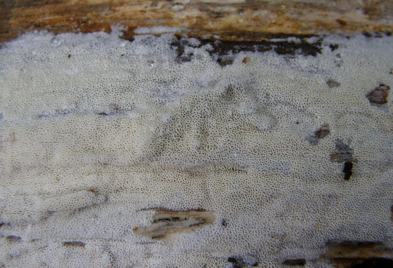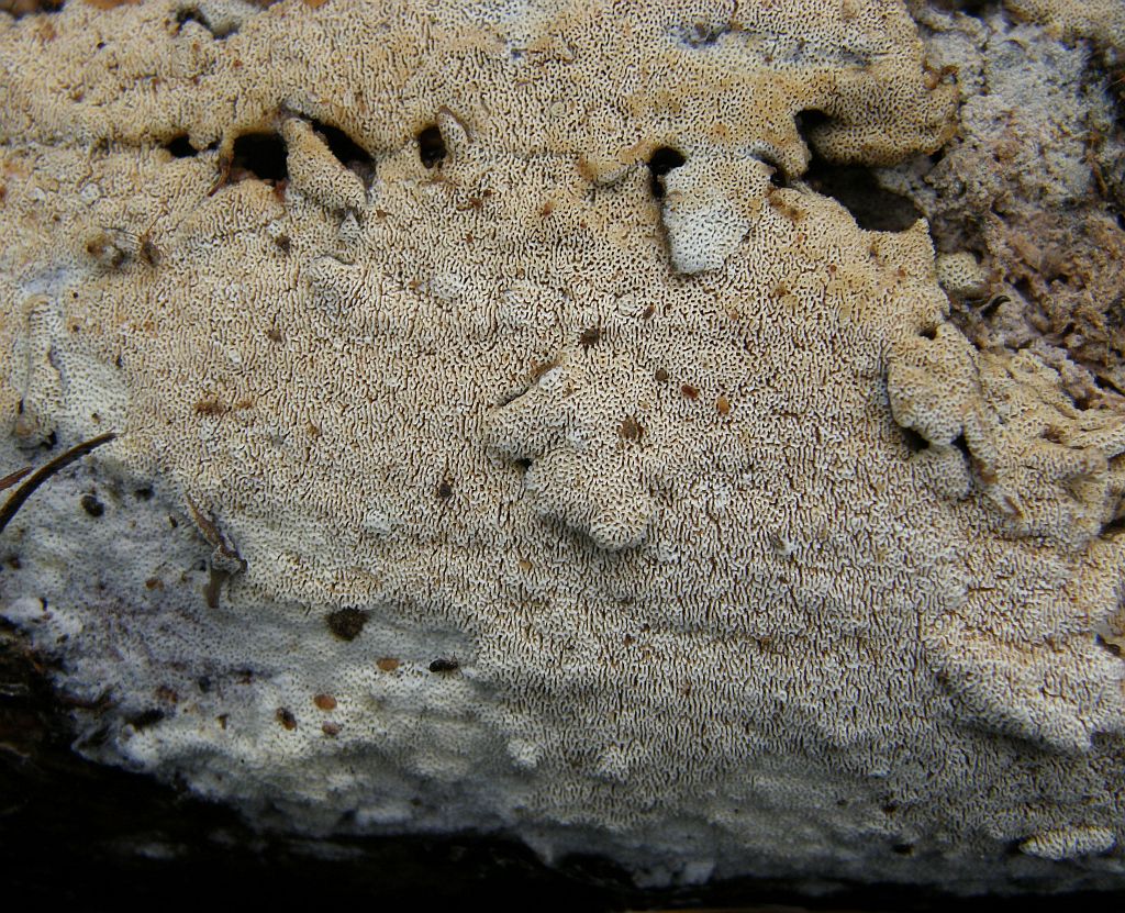 Makroskopische Merkmale: Der Pilz bildet gelblich bis ockerfarbene resupinate Fruchtkörper an abgestorbenen Laubholz seltener Nadelholz, eine bestimmte Holzstamm grösse konnte ich nicht beobachten, er kann sich breit machen so wohl an dicke am Boden liegende Stämme als auch an Äste. Die Poren sind unregelmäßig rundlich bis labyrinthisch können aber mit den Alter und je nach Wuchslage auch geschlitzt sein, da ist eine Verwächslung mit der sehr Ähnlich Schizopora paradoxa möglich, Poren 2(3)-4/mm.