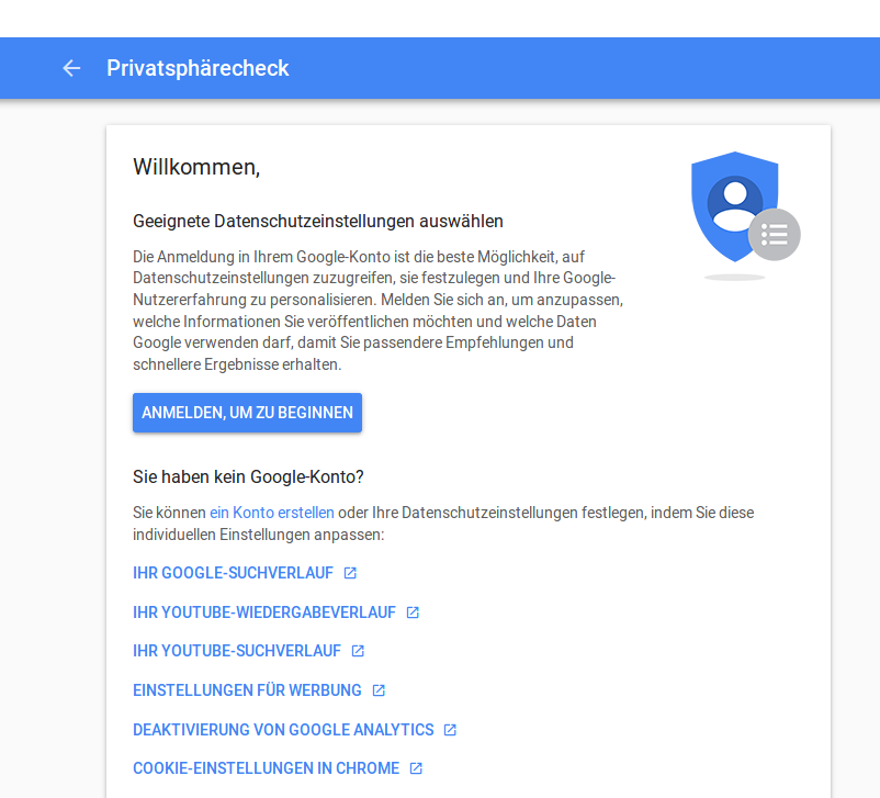Vielleicht bin ich einfach zu blöde für dies alles (ist hier durchaus vorstellbar ;) ) aber ich habe versucht herauszufinden was genau Google denn von mir gespeichert hat, habe versucht meine Einstellungen zu ändern - laut Google ist dies ja alles ganz einfach zu überprüfen und die Einstellungen sind ganz einfach zu ändern. Nun - sooo einfach scheint dies nicht zu sein! Um einsehen zu können, um Änderungen vornehmen zu können, müsste ich anscheinenden erst einmal bei Google angemeldet sein! Bin ich aber bisher nicht! Und ich weiß auch ehrlich gesagt nicht so genau was dann wiederum mit einer Anmeldung mit meinen Daten passiert.