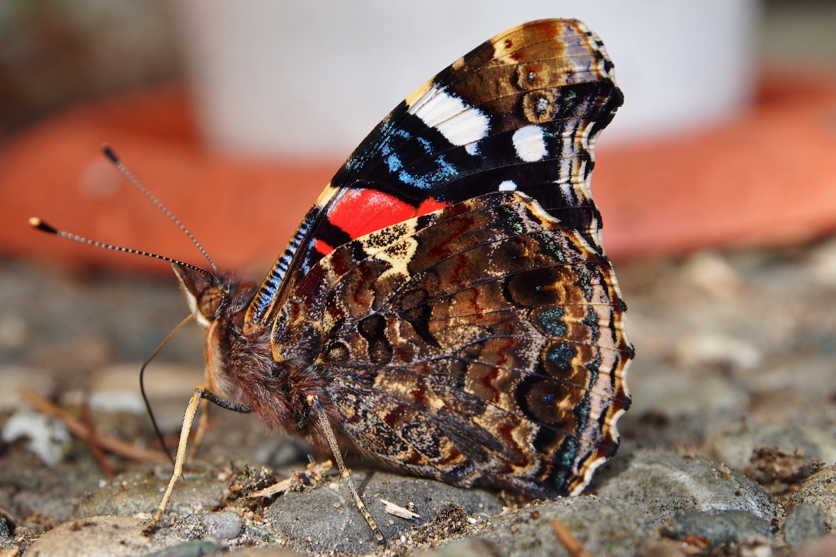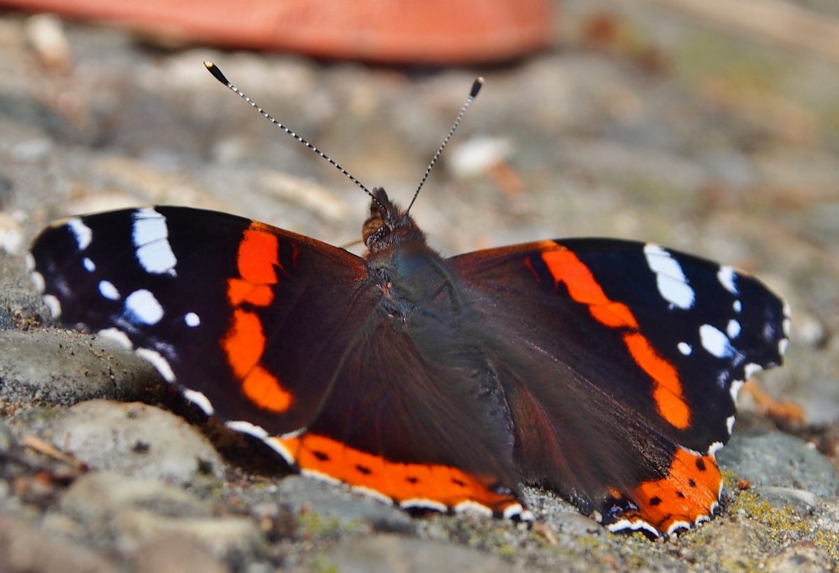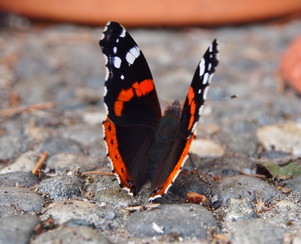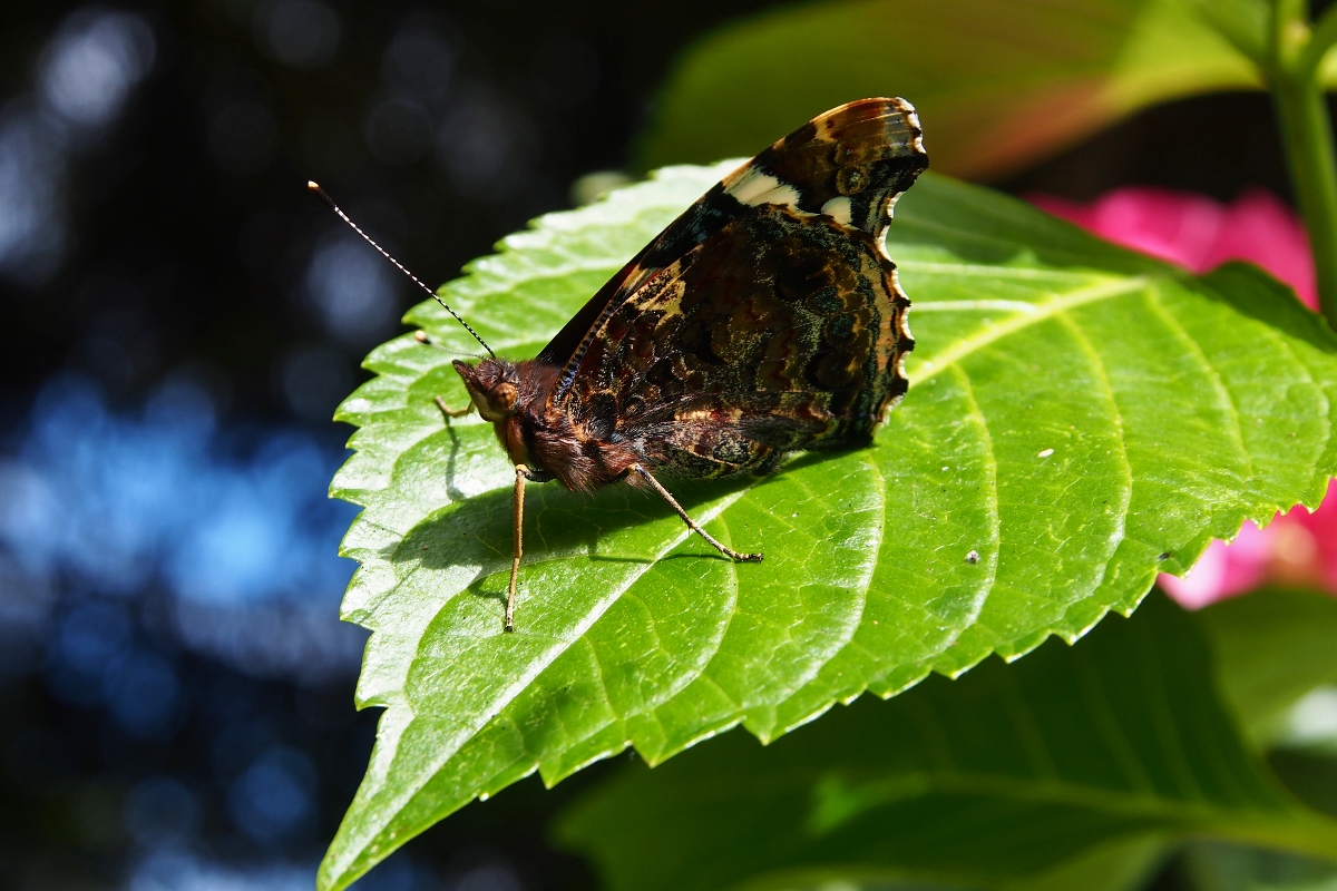 Erst erkundete er die Terrasse und flatterte in der Abendsonne hin und her. Ich holte die Kamera in der Hoffnung auf einen guten Schnappschuss. Das Gerät kannte er wohl –“ ob er irgendwann mal eine Model-Ausbildung gemacht hat? –“ und setzte sich erst in Pose auf die Hortensie, wollte aber noch nicht seine ganze Pracht zeigen.