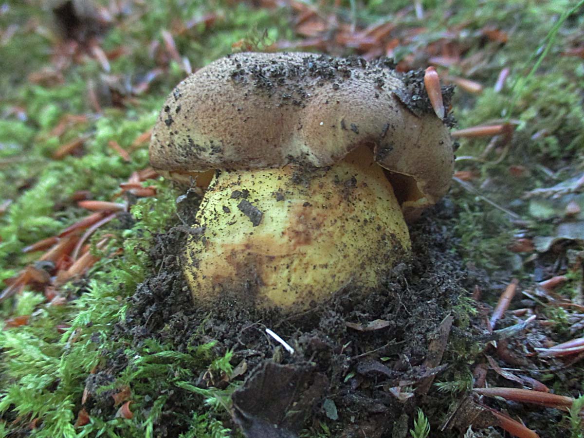 Als erstes stolperte ich über einen von den Hexenpilzjägern umgeworfenen, bei mir sehr seltenen Anhängselröhrling (Butyriboletus appendiculatus) mit seinen wachstumsgeschädigten Brüdern.