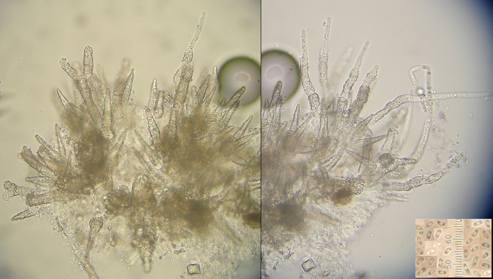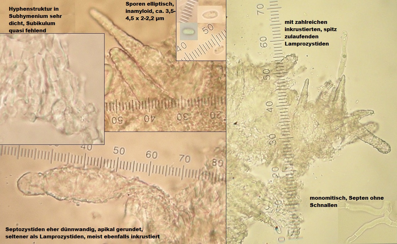 Wie man sieht sind die Stacheln winzig, der Fruchtkörper hat eine wachsartige Konsistenz und lässt sich sehr gut vom Substrat (ein Stück Laubholz Ast das halb in ein leeres Bachlauf stand) abschaben. Ein Blick in die Tiefe zeigt einen massiven vorkommen von Dickwandige Lamprocistiden.
