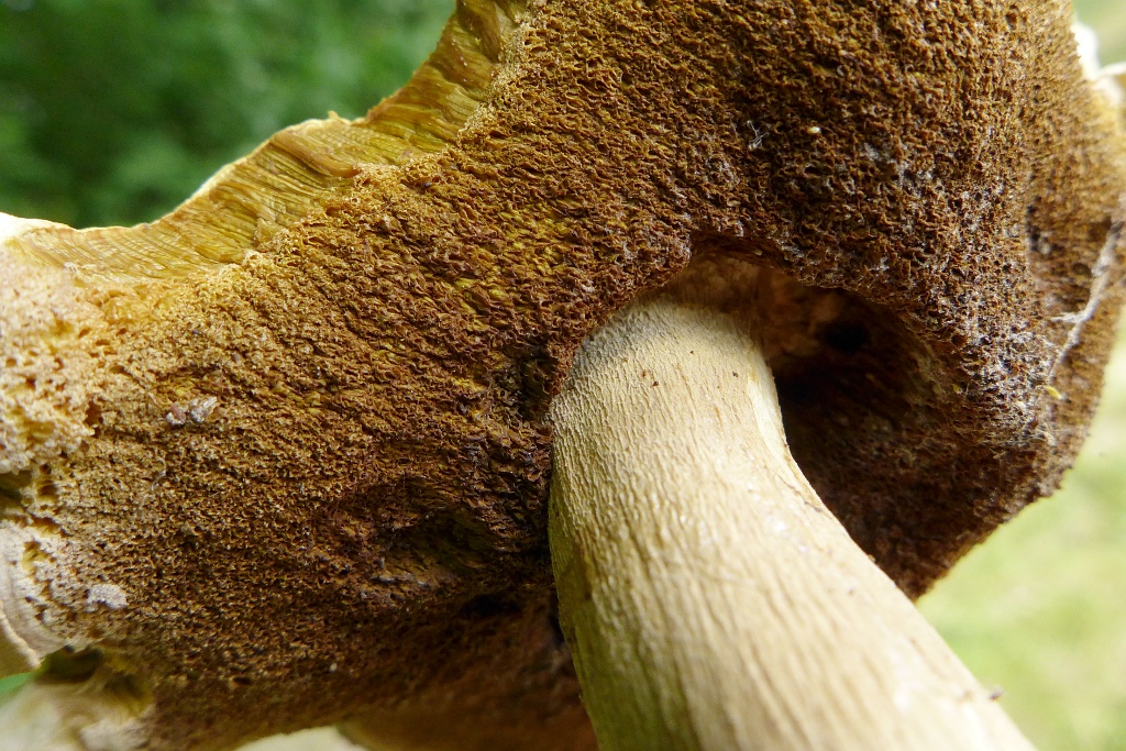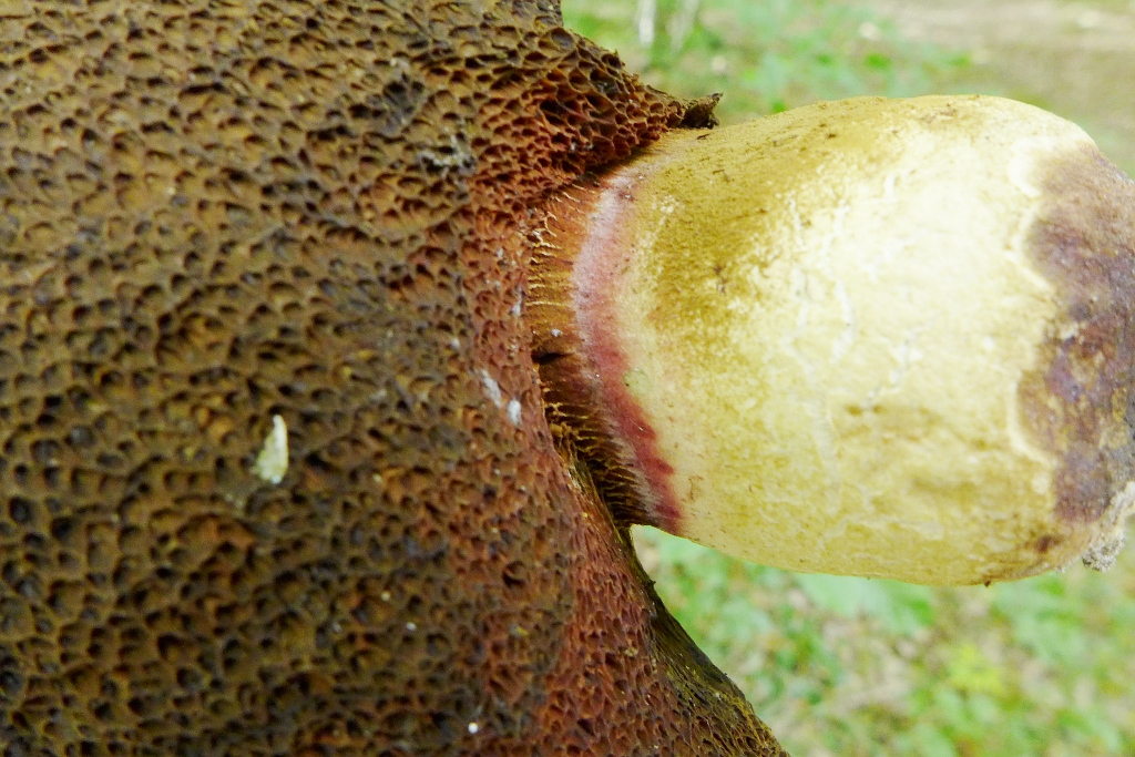 Stieloberfläche nur OBEN mit rötlichem Bereich , ansonsten gelb/ olivgelb - etwas filzig aufschuppend darunter weißliches Fleisch, keine Körnchen, kein Netz, Stiel außen auch nicht deutlich blauend (Trockenheit ?).
