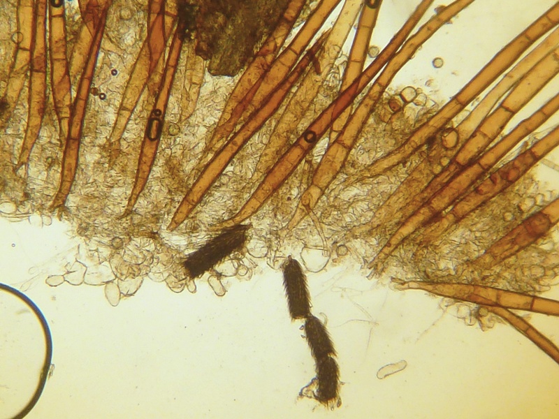 Ein ganz typischer Fall von Scutellinia minor. Neben dem typischen Sporenornament und den sehr dicht stehenden Randhaaren, fanden sich auch zwischen diesen ebenfalls typische, geschwollene hyphoide Haare die stets abgerundet sind.