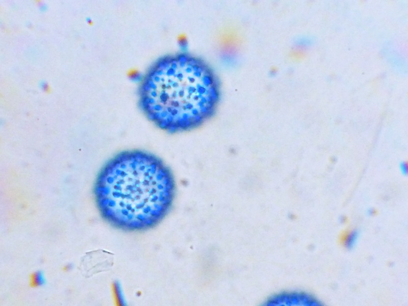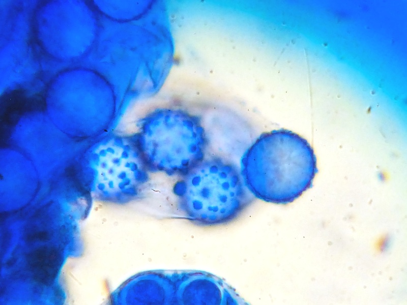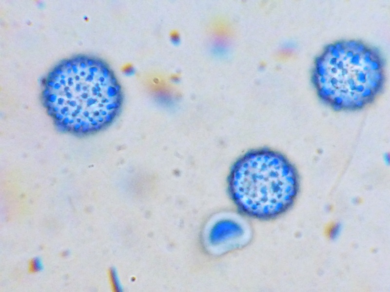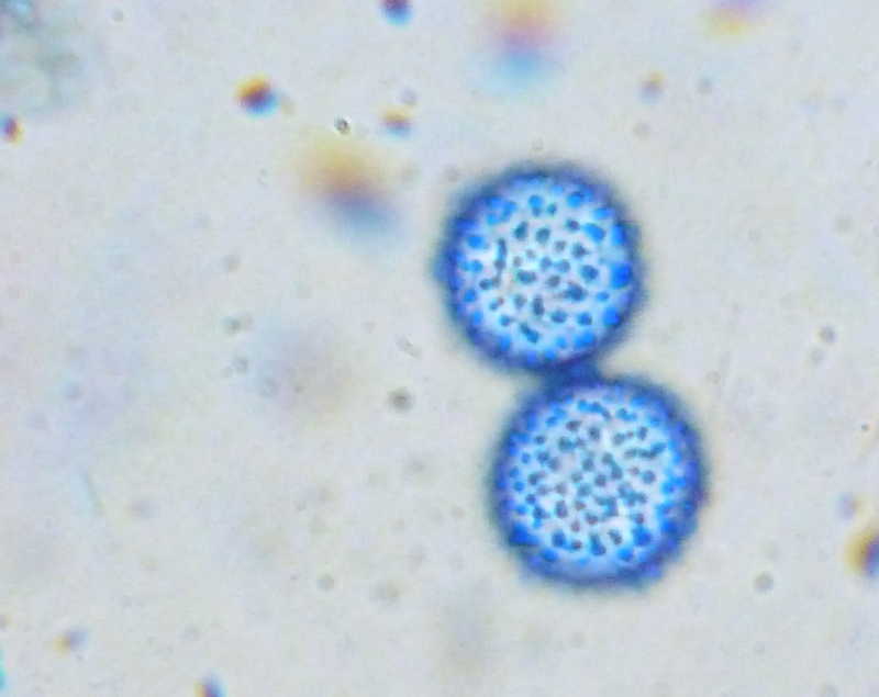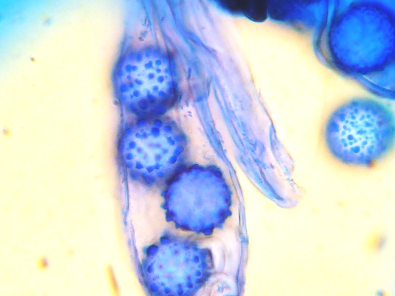 Es wird spannender. Aus zwei Gründen. Zum einen besaßen die Haare unter dem Mikroskop eine völlig andere Farbe. Das Rot war viel dunkler, fast ins Weinrot reichend. Die Wurzeln multifurcat. Zudem waren die Sporen deutlich schwächer ornamentiert und deutlich schmaler.