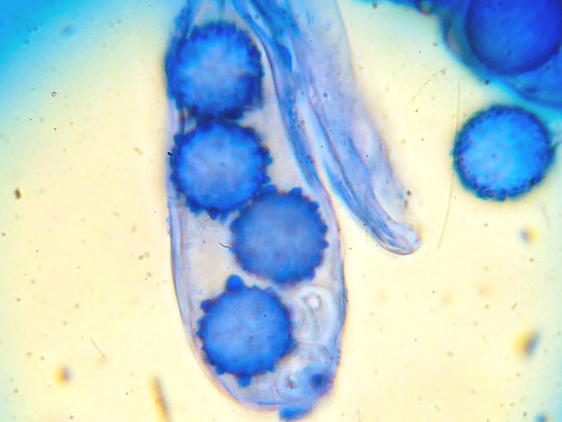 Kollektion 4: Kurz gesagt - hier lande ich bei Scutellinia scutellata. Im Vergleich zur vorherigen Kollektion kommen genau die von Ralf erwähnten Unterscheidungsmerkmale zum Tragen. Die Haarwurzeln sind multifurcat, das Ornament der Sporen ist deutlich schwächer. Der Wuchs auf Holz war nicht erkennbar. Interessant wäre in dem Zusammenhang noch zu wissen, ob die Farbe der Randhaare eventuell auch auf Dauer als arttypisch erkannt werden kann. Bzw. erst einmal: Liege ich richtig?