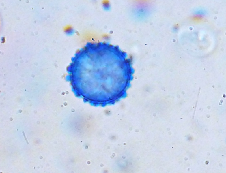 Buchenwald-Becherling (Peziza arvernensis), typisch mit feinwarzigen, recht breiten Sporen und erkennbarer mittlerer textura intricata
