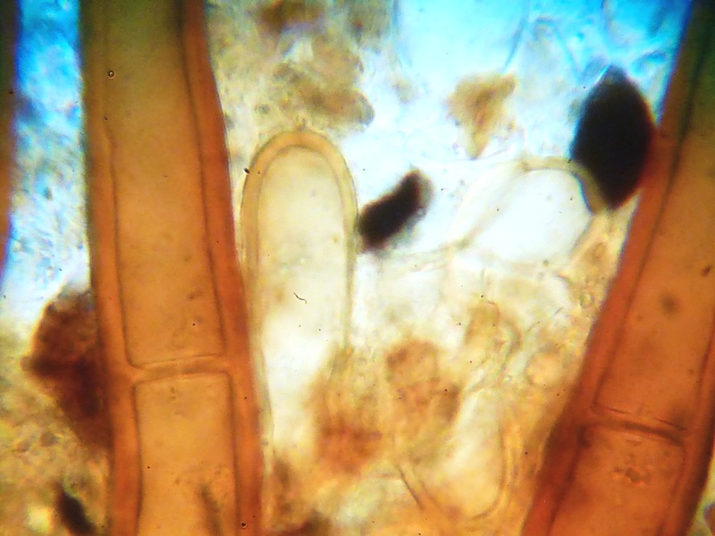 Es wird spannender. Aus zwei Gründen. Zum einen besaßen die Haare unter dem Mikroskop eine völlig andere Farbe. Das Rot war viel dunkler, fast ins Weinrot reichend. Die Wurzeln multifurcat. Zudem waren die Sporen deutlich schwächer ornamentiert und deutlich schmaler.