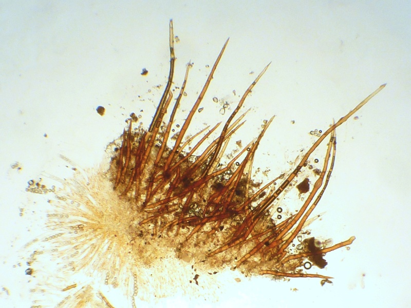 Die Haare waren, obwohl makroskopisch scheinbar deutlich länger, in etwa so lang wie bei der ersten Kollektion. Durch die unterschiedliche Größe der Fruchtkörper (Kollektion 1 um 1 cm, Kollektion 2 um 3-4 mm) und die unterschiedliche Krümmung der Becher entstand wohl der optische Größenunterschied.