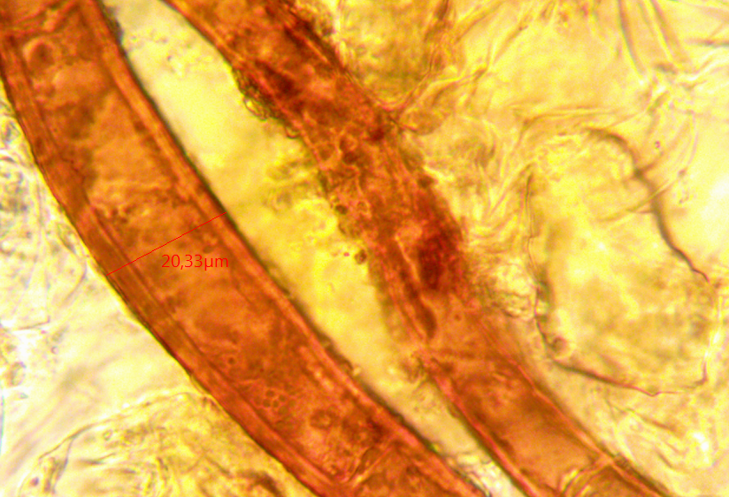 bei den Haaren muss man Lateral- und Marginalhaare untersuchen. Man achtet auch auf hyphoide Haare zwischen den regulären, also ob solche vorkommen oder nicht. Wie dicht sind die Haare angeordnet. Neben der Länge und Breite der Haare ist die Dicke der Haarwand zu beachten und die Septierung. Wieviele Septen und wie sind sie verteilt. Die Farbe kann ebenfalls wichtig sein und ob die Haare durchweg gleich gefärbt sind oder zur Wurzel oder Spitze hin heller oder dunkler werden. Die Form der Haare ist wichtig. Sind sie gerade, oben gekrümmt, S-förmig verbogen, im ganzen gekrümmt, bauchig, schmal, dick usw.
