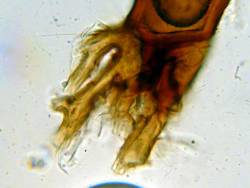 Und dann fand ich noch das hier und dachte zunächst, es würde sich um sternförmige Haare handeln. :shy: Allerdings sah man sie schon unter der Stereolupe und sie waren hyalin und auf bzw. zwischen den Fruchtkörpern. Irgendwie seltsam, aber wohl nicht bestimmungsrelevant.