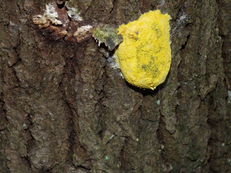 Ist der erste eine Gelbe Lohblüte? Roch nach Pilz, war recht schleimig, als ich es berührte wischte ich sofort ein Stück der gelben Oberfläche ab, darunter war es schwarz, sieht man auch auf den Bild. Der Baum war abgeholzt, sieht man auf dem Bild schlecht. Ich denke es war ein Nadelnbaum.