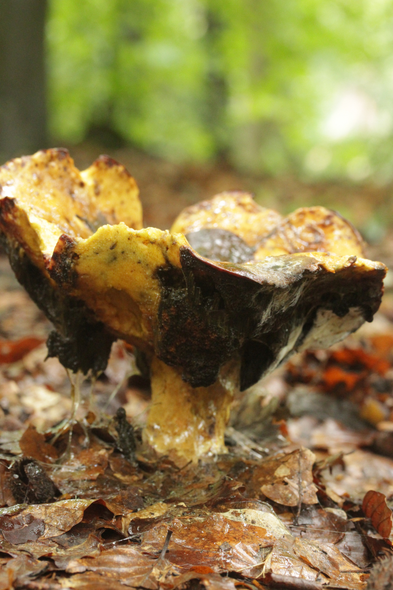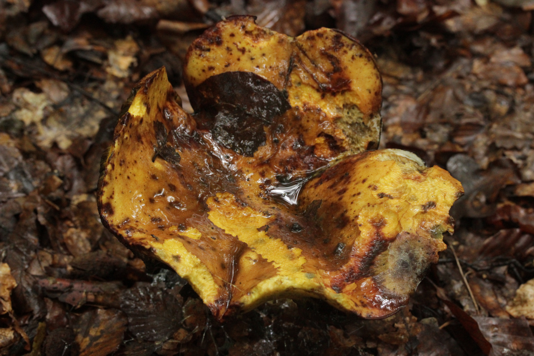 14. Anschließend ging es dann zur Leichenfotographie. Ich vermute mal Boletus erythropus, soweit man das ohne Stiel und Röhren noch sagen kann. Als ich andächtig vor dem Pilz kniete und meine Fotos machte, bemerkte ich auf einmal einen ekligen Geruch in meiner Nase... der Pilz kann doch nicht nach Hundescheiße riechen? Nein tat er auch nicht, stattdessen kniete ich in selbiger und hatte sie na Hose und Jacke. Total bedient ging es dann an den nahegelegen Rotbach um mich halbwegs zu reinigen....