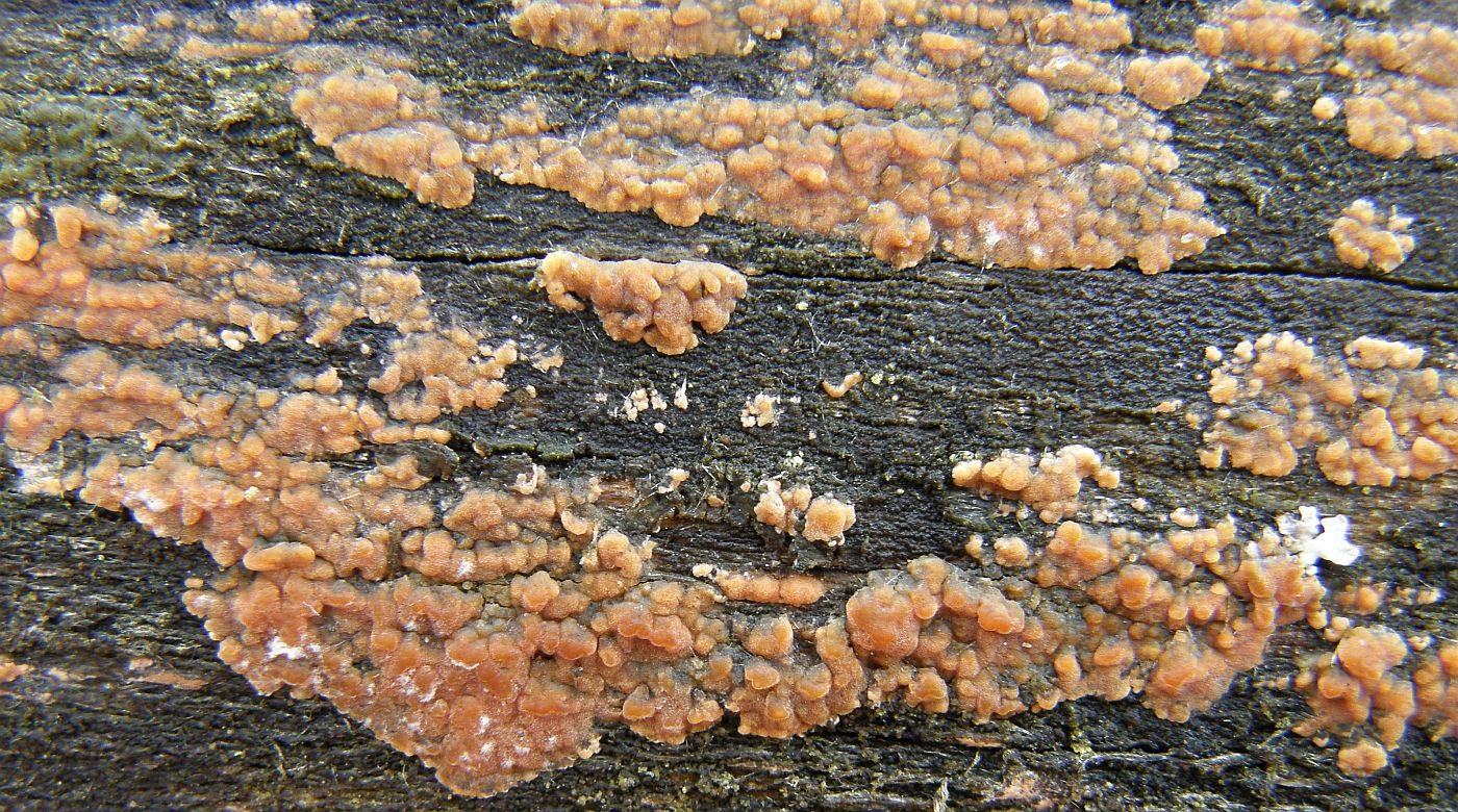 makroskopische Eigenschaften: Fruchtkörper resupinat wachsend, bildet 1 mm dicke glatte belege, orange bis rötlich gefärbt mit weissen Rand bei frische Fruchkörper, in alter aufreissend. Der Pilz kommt mit vorliebe an Buche vor ist aber auch bei anderen gehölze nicht nicht Fremd.