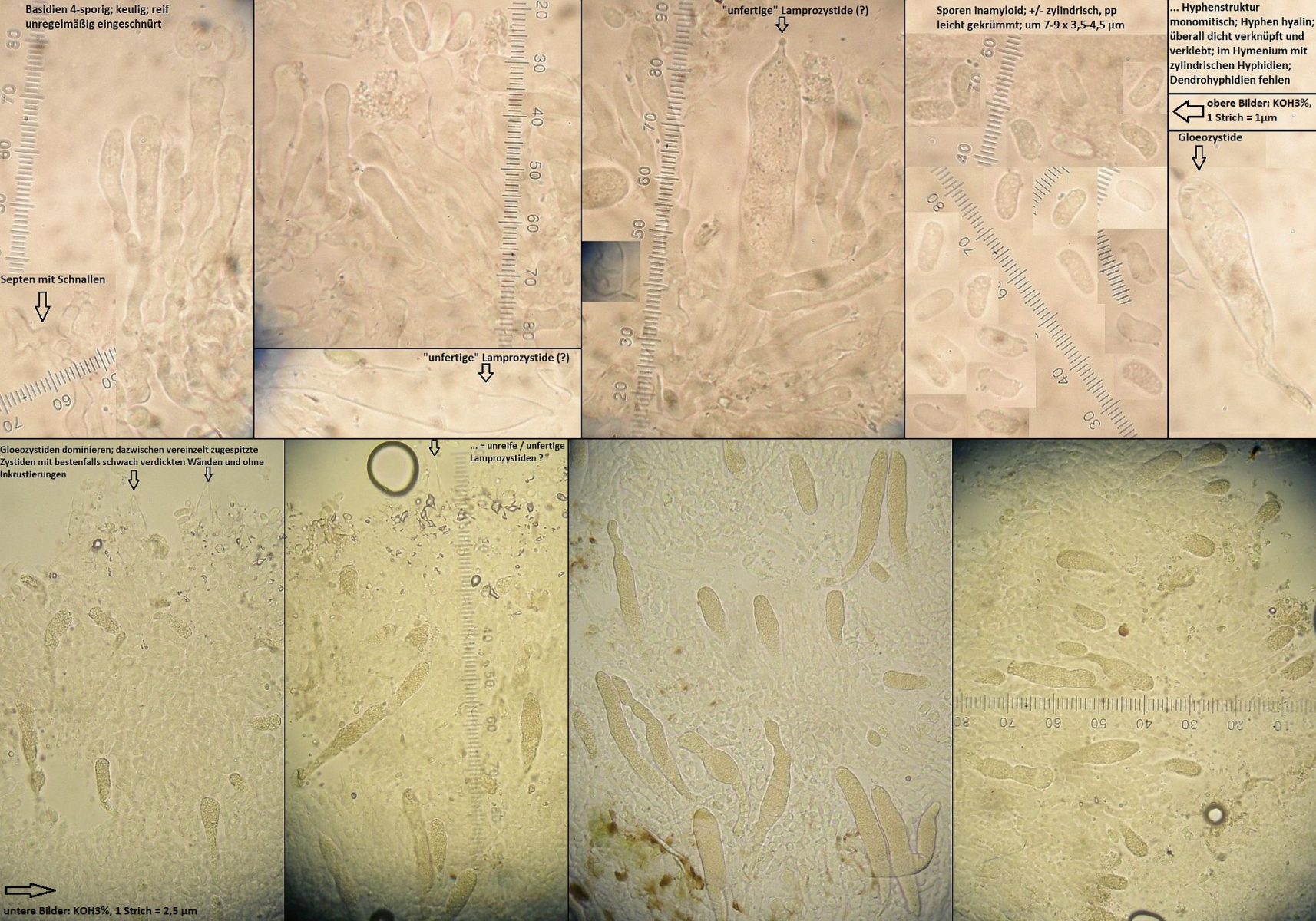 mikroskopische Eigenschaften: Wichtige mikroskopische Merkmal dieser Pilz sind die Viele Gloeocystiden die mit Sulfovanillin schön schwarz werden und die kleinere Sporen 8-10(12)x3,5-5 µm gegenüber die sehr ähnliche P. auriantaca, der Pilz hat ein monomitischer Hyphensystem mit viele Spitzendenden Lamprocystiden, Basidien sind unauffällig.