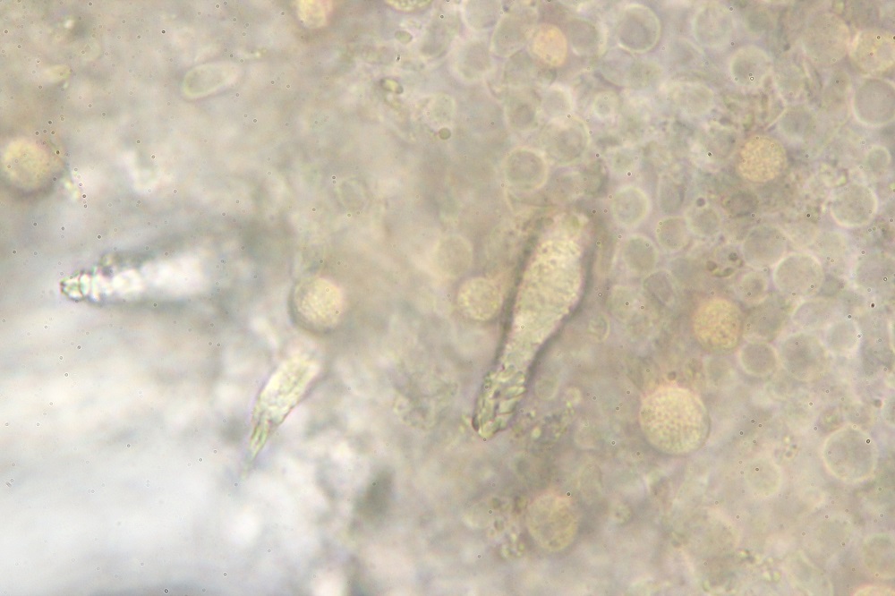 Gloeocystiden mit Sulfovanillin gefärbt