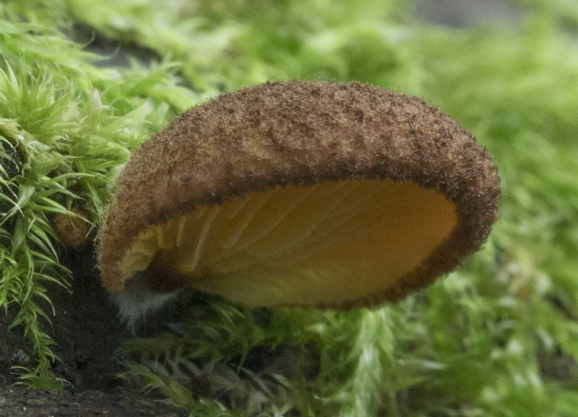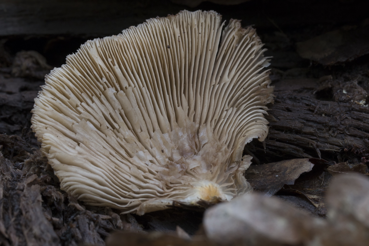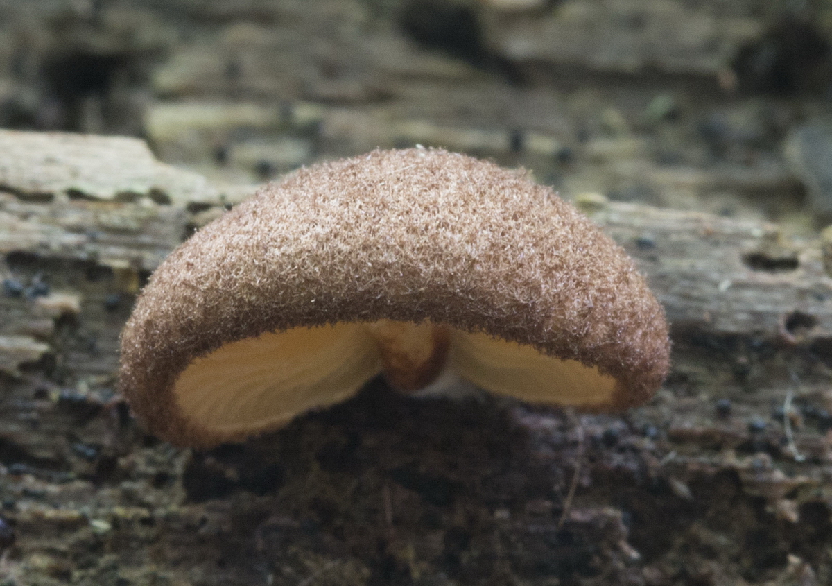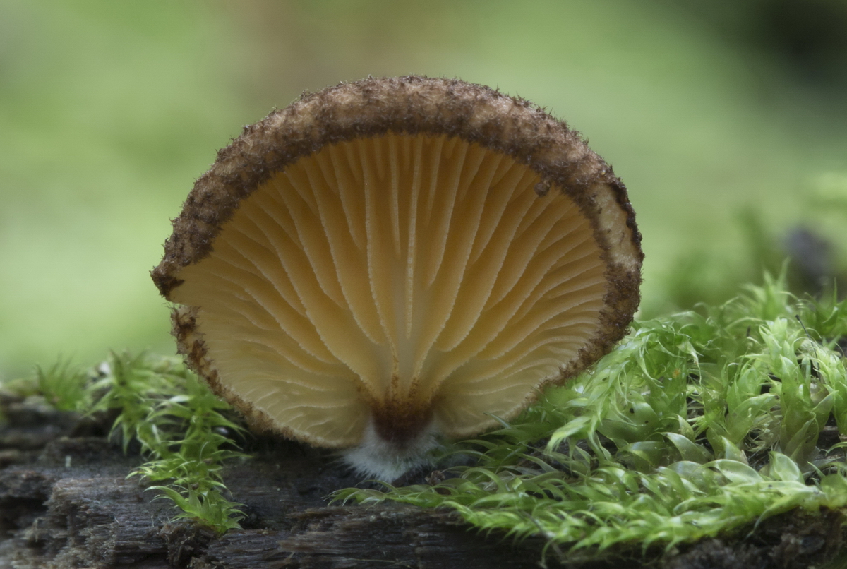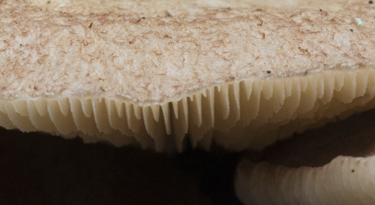 Fruchtkörper nahezu stiellos am Substrat angewachsen. Die Lamellen reichen bis zum Substrat.