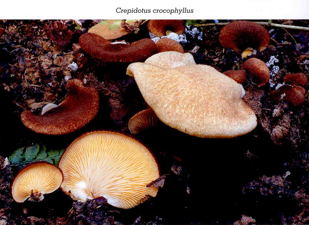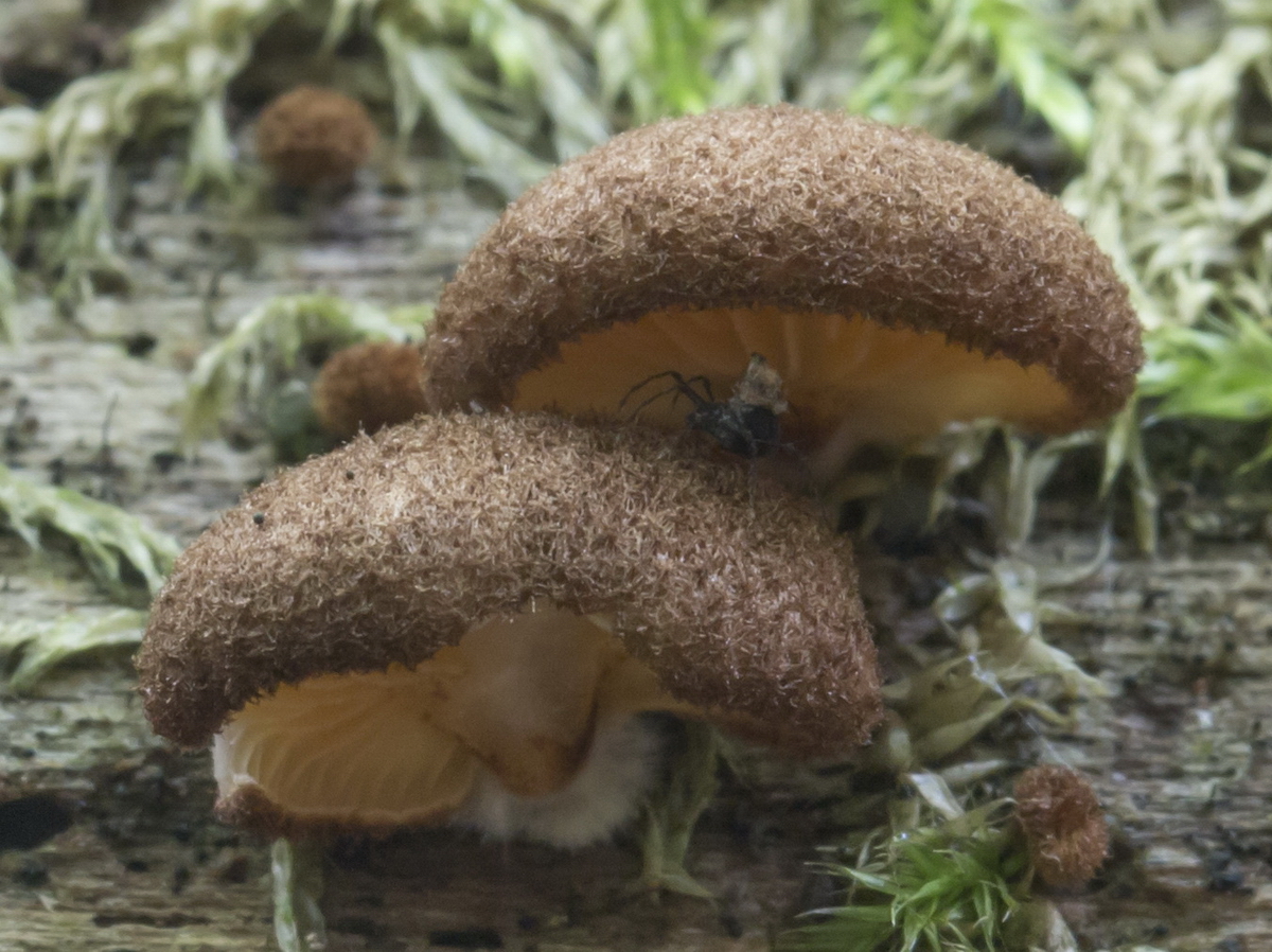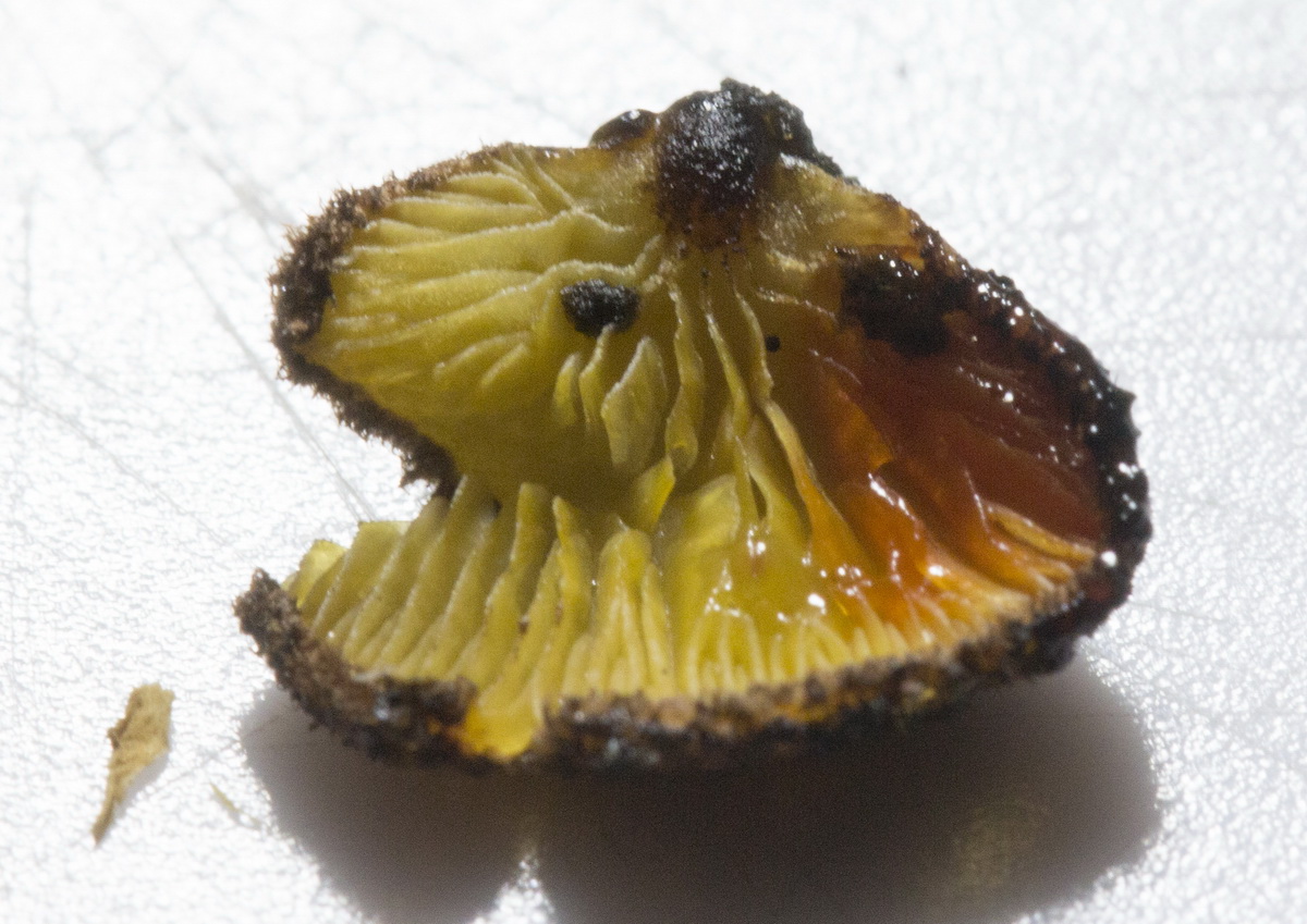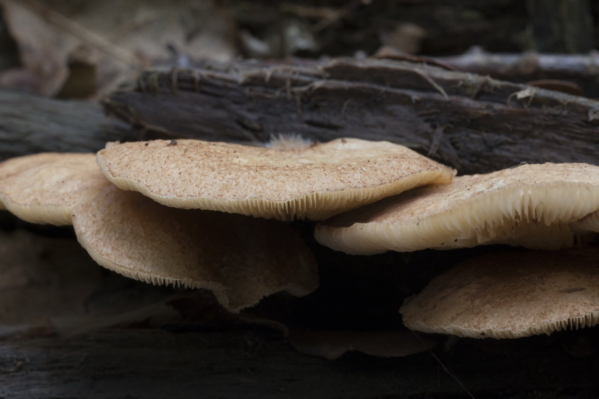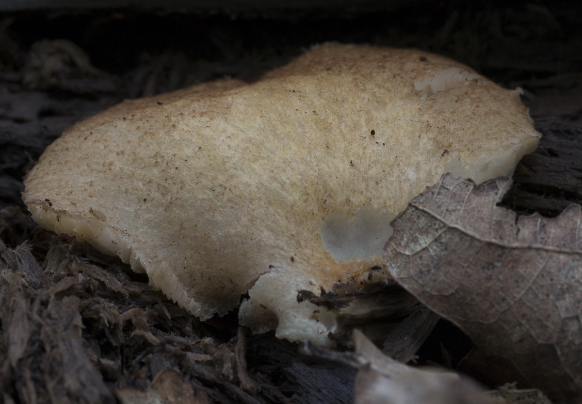 Fruchtkörper nahezu stiellos am Substrat angewachsen. Die Lamellen reichen bis zum Substrat.