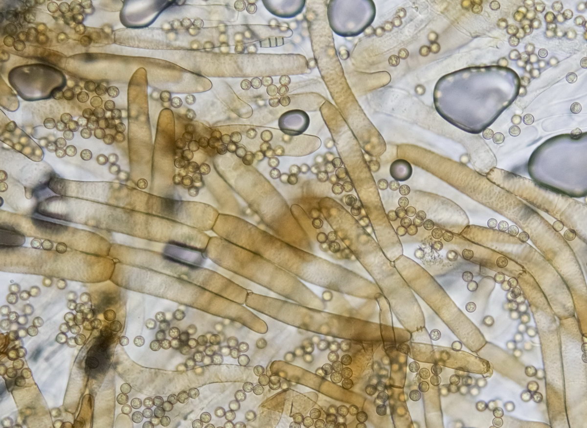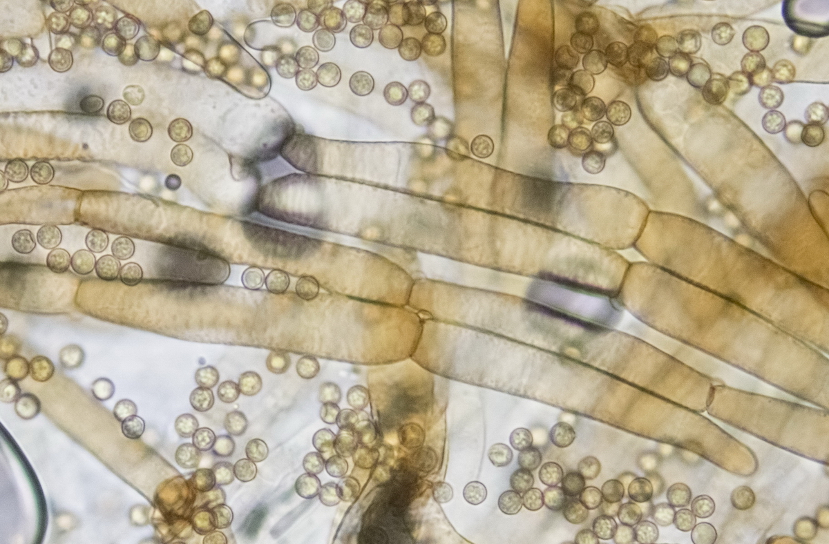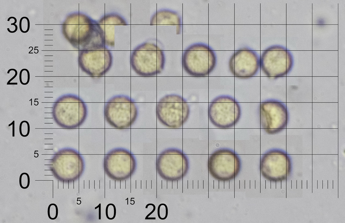 Sporen rund und feinwarzig, golfballartig, mit Keimporus. Durchmesser 6 µm, recht gleichmäßig ohne große Toleranz.