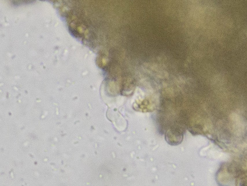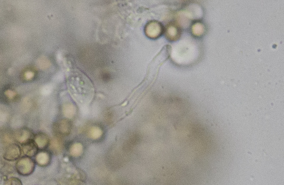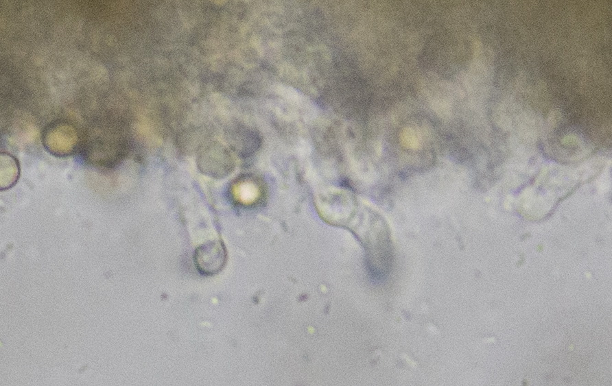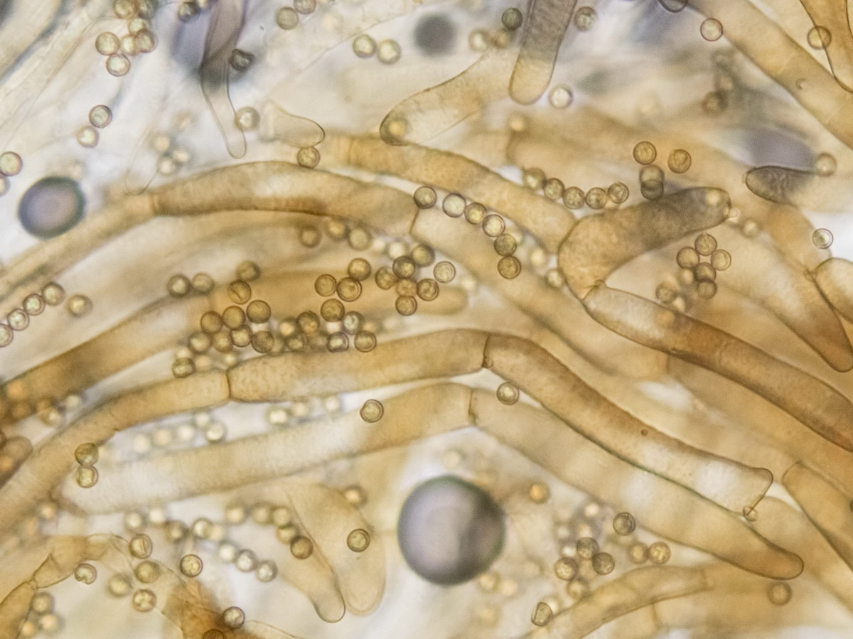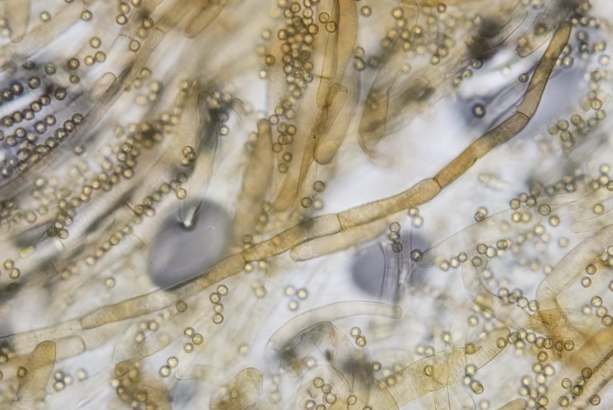 Sporen rund und feinwarzig, golfballartig, mit Keimporus. Durchmesser 6 µm, recht gleichmäßig ohne große Toleranz.