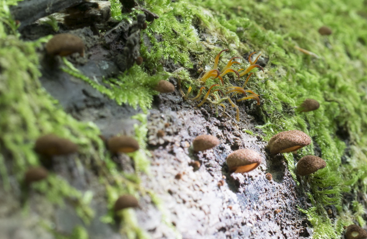 Substrat (schon ziemlich vermorscht) wahrscheinlich Hainbuche, evtl auch Eiche. Auf jeden Fall Laubholz, es sei denn, es hat hier den einzigen Nadelbaum gekostet.