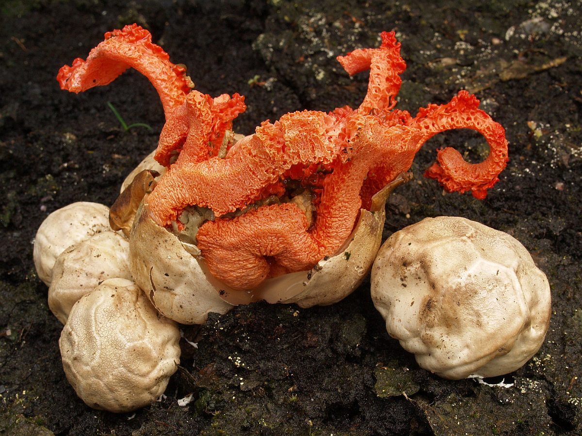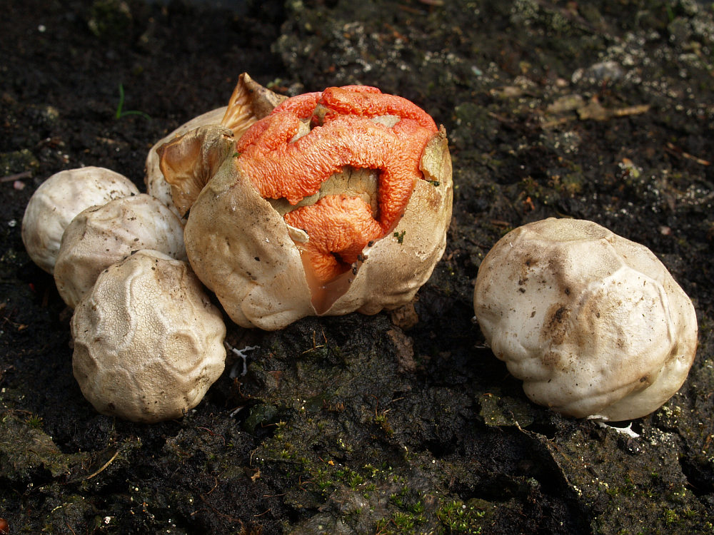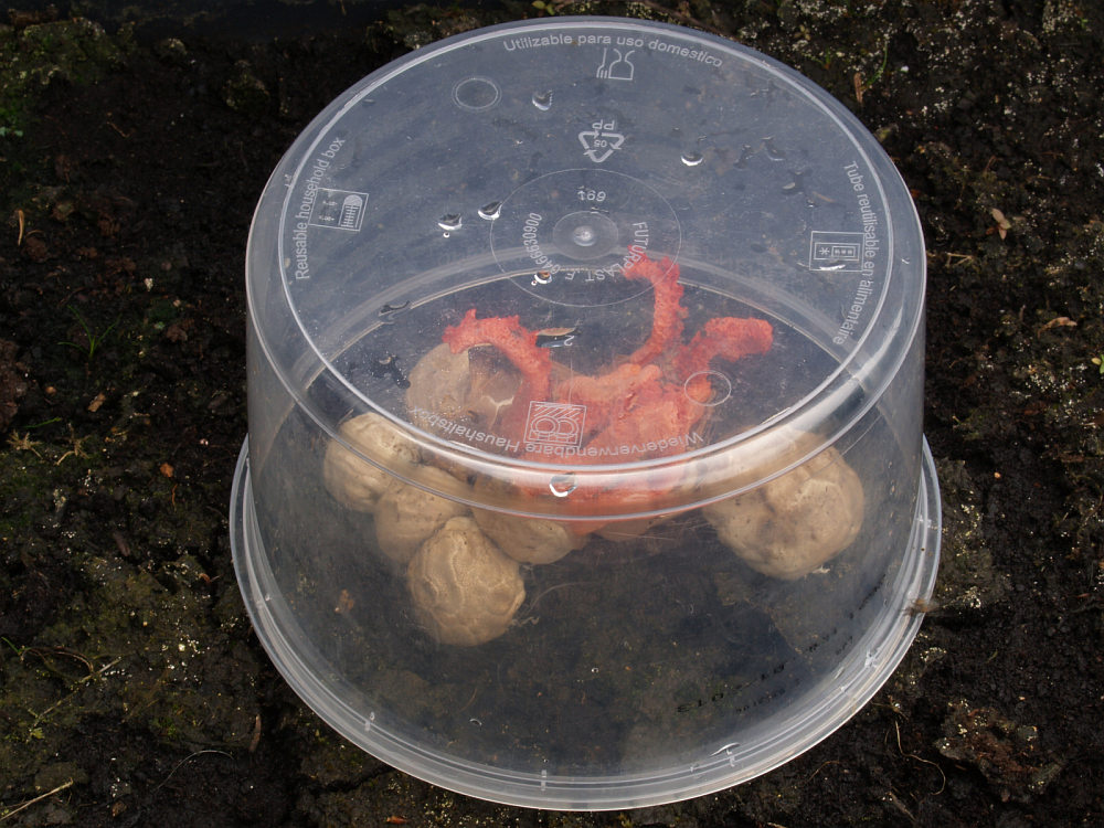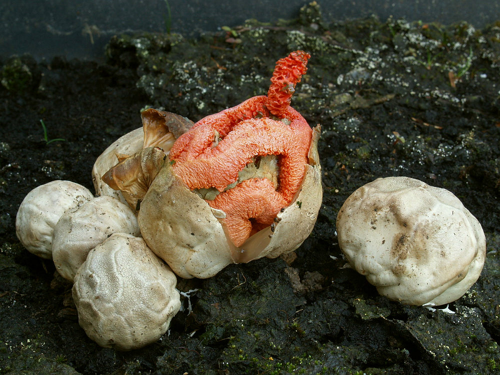 Gestern wurde mir in einem Garten auf Rindenmulch eine am Niederrhein immer noch sehr seltene Art gezeigt. Der Rote Gitterling (Clathrus ruber) entwickelt sich wie Stinkmorchel, Tintenfischpilz und Hundsruten aus einem sogenannten Hexenei. Das größte Exemplar war leider schon eingetrocknet.