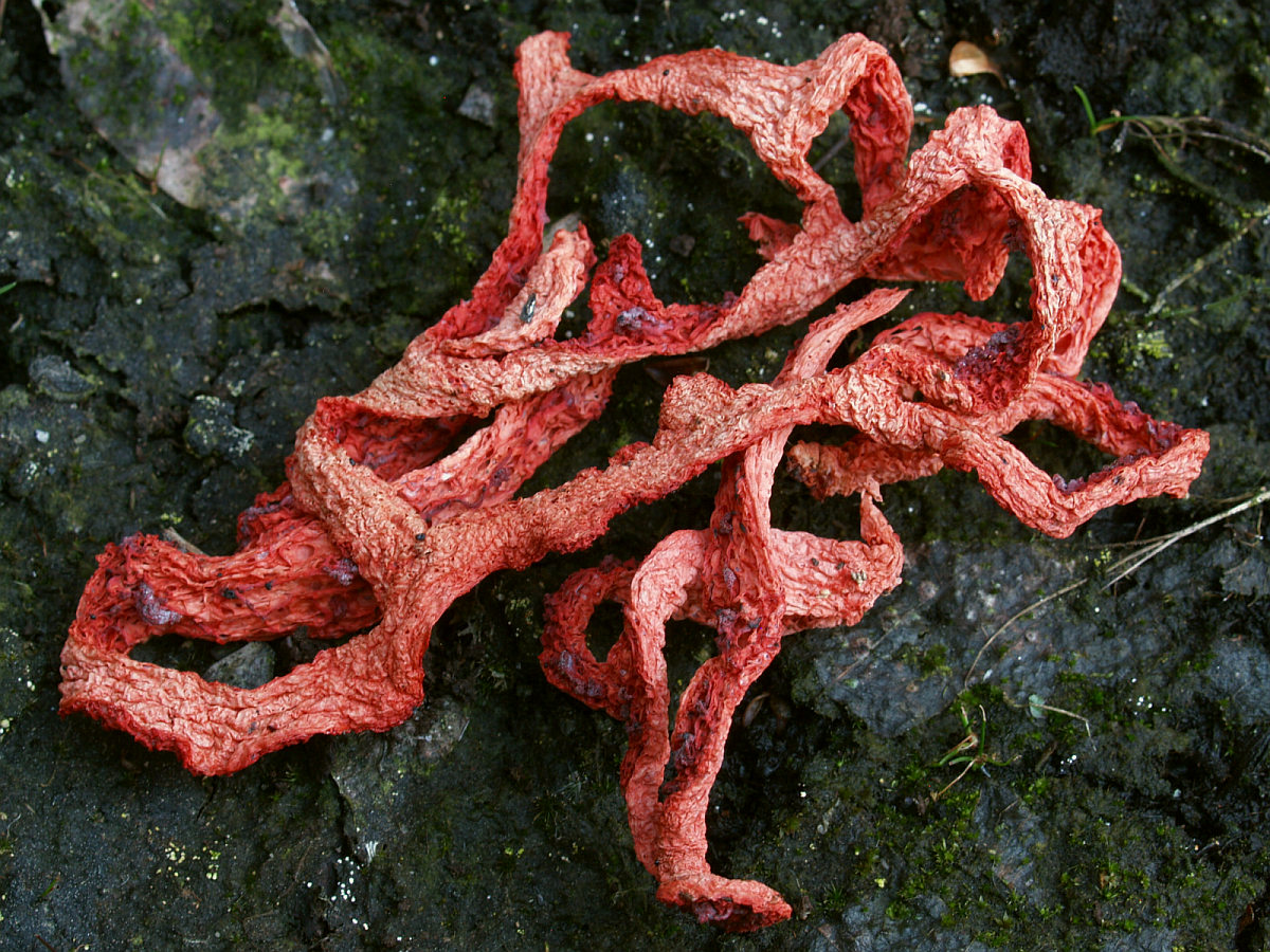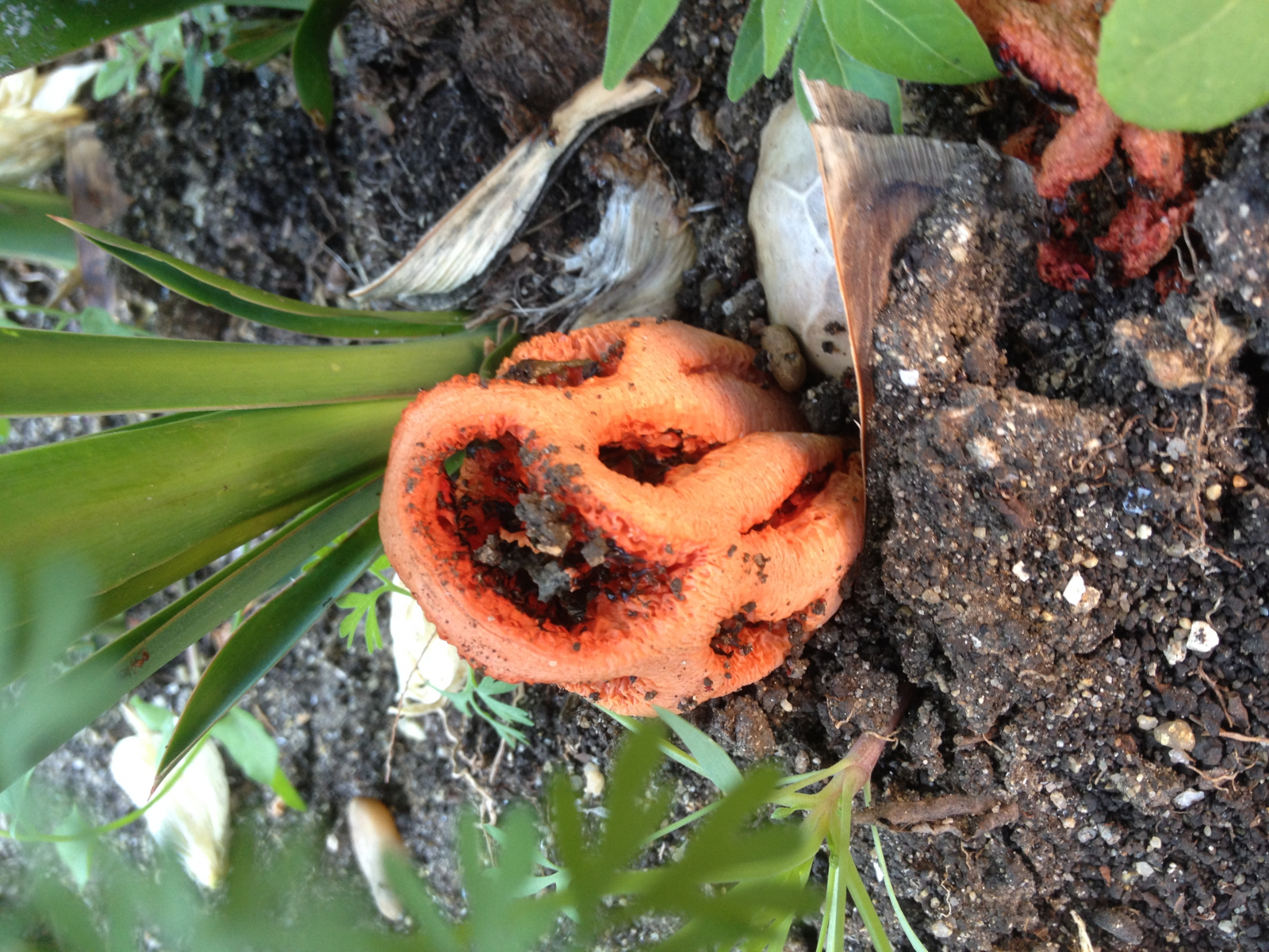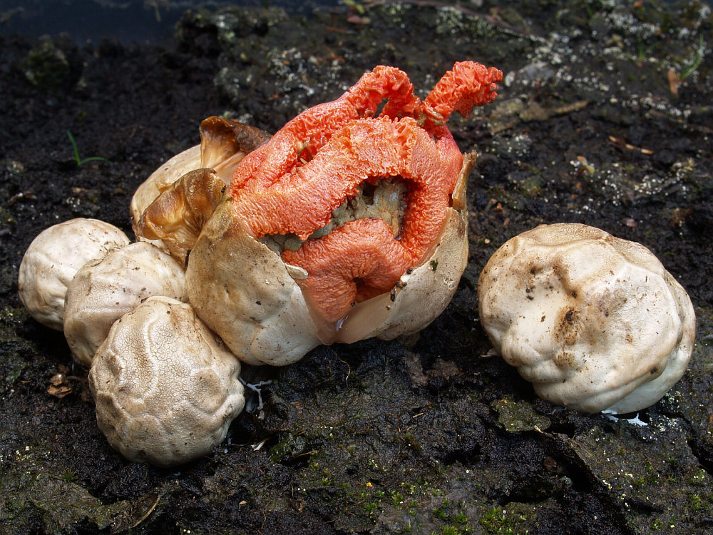 Gestern wurde mir in einem Garten auf Rindenmulch eine am Niederrhein immer noch sehr seltene Art gezeigt. Der Rote Gitterling (Clathrus ruber) entwickelt sich wie Stinkmorchel, Tintenfischpilz und Hundsruten aus einem sogenannten Hexenei. Das größte Exemplar war leider schon eingetrocknet.