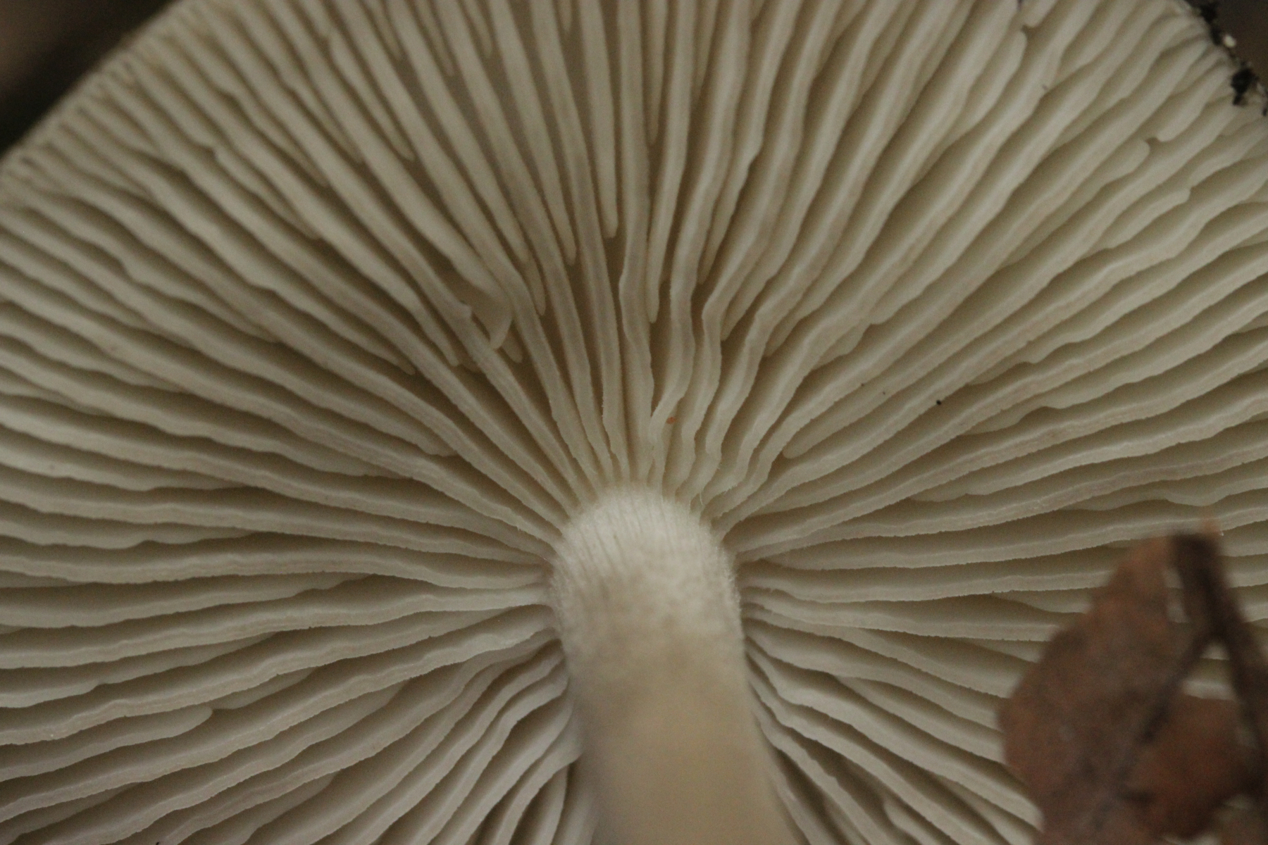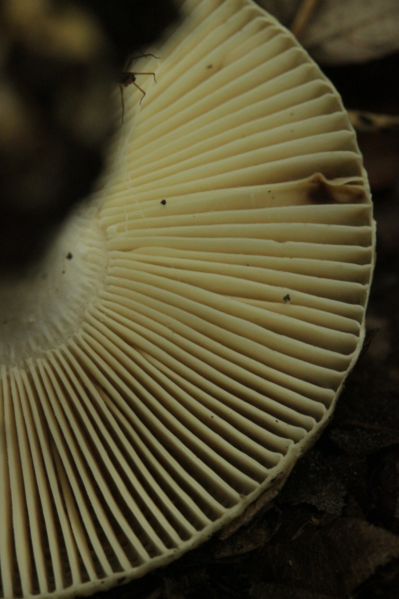 22. Russula sp. mit gelbem Sporenpulver, kein besonderer Geruch. Man beachte auch den eingewachsenen Hut an der Seite.