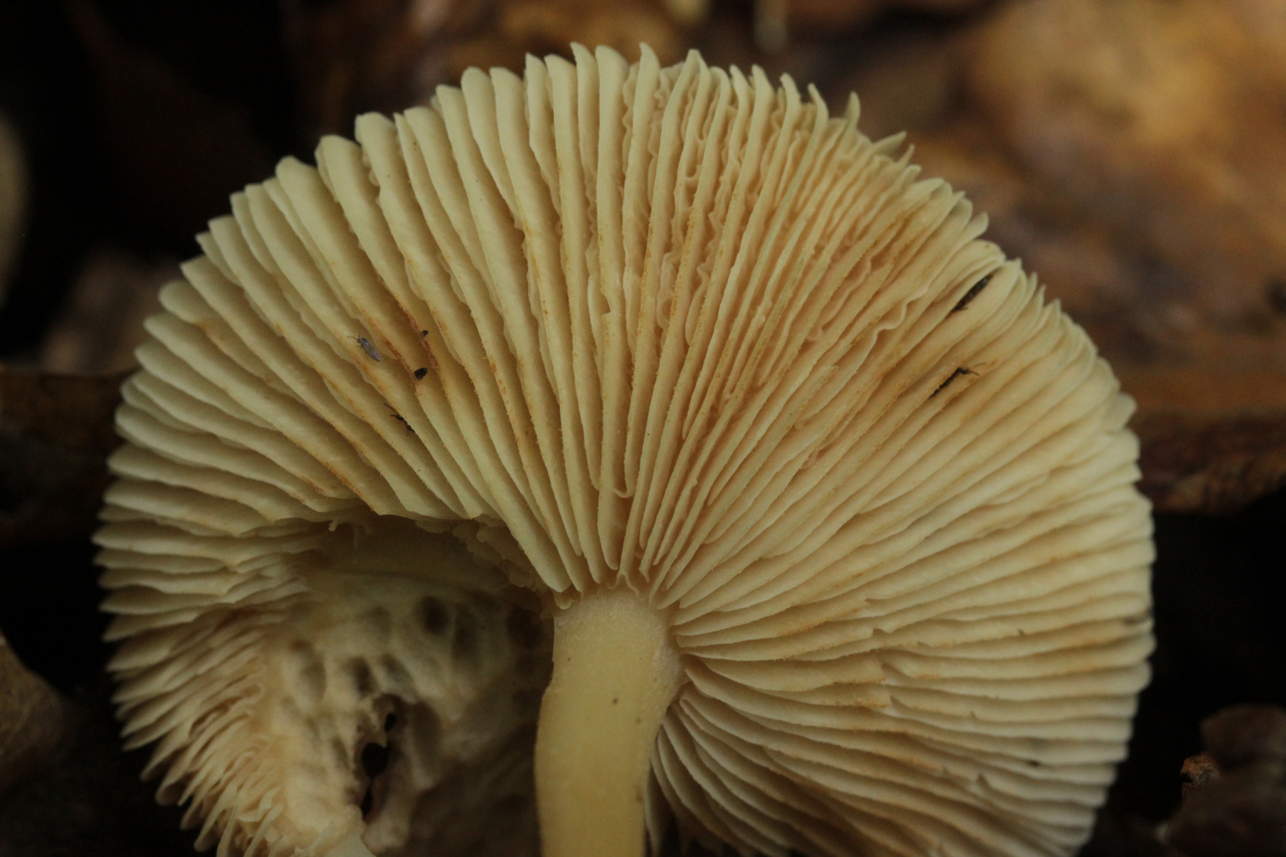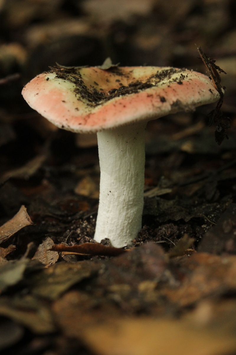 22. Russula sp. mit gelbem Sporenpulver, kein besonderer Geruch. Man beachte auch den eingewachsenen Hut an der Seite.