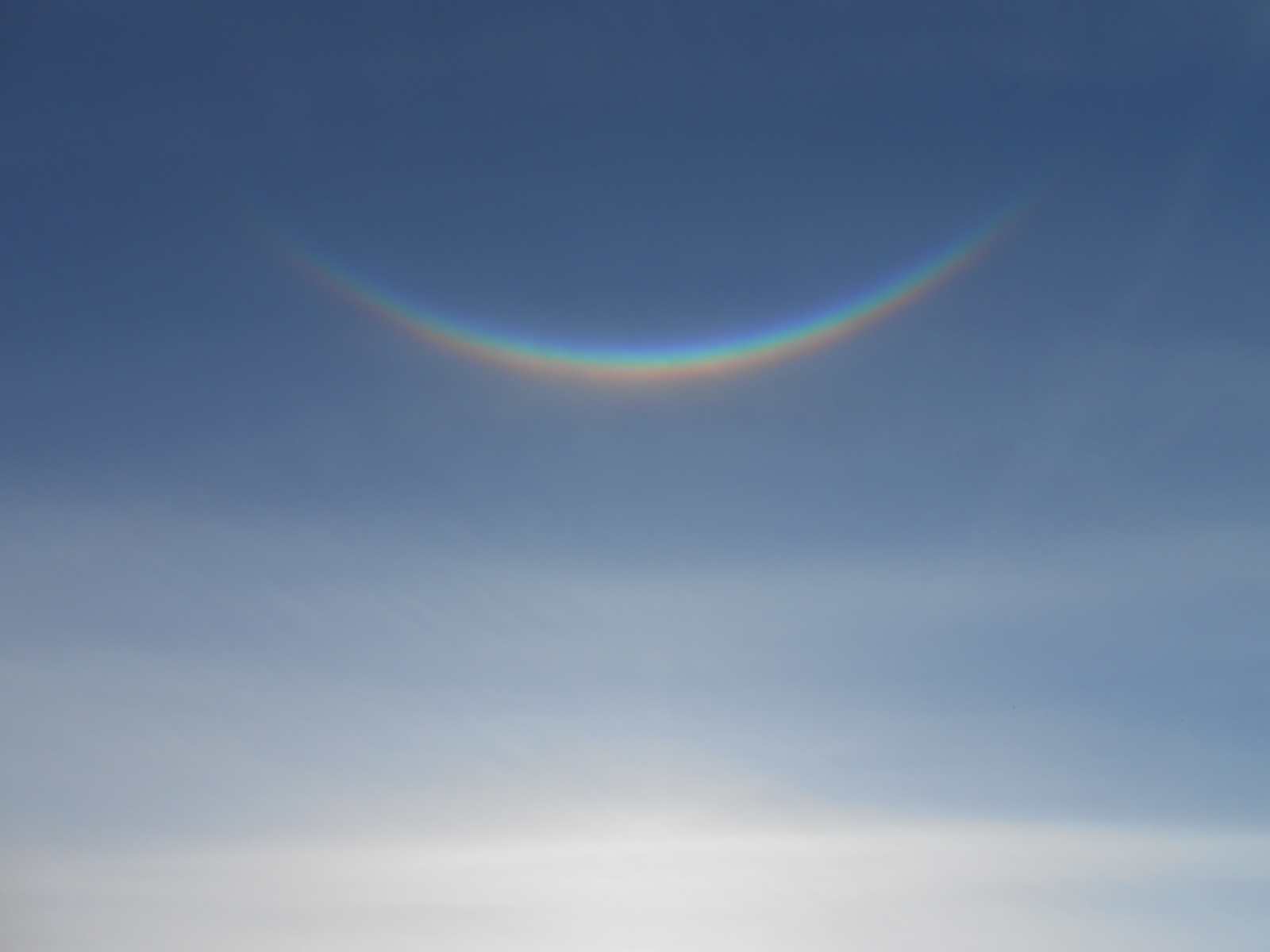 Sogenannte Nebensonnen hat man ja öfter, aber den "Zirkumzenitalbogen" sieht man in unseren Breiten sehr selten. Es war ein atemberaubendes Schauspiel, diesen durch Eiskristalle in hohen Lagen verursachten "verkehrten Regenbogen" zu beobachten. Es sah aus, als habe der Himmel uns bunt zugelächelt...:)