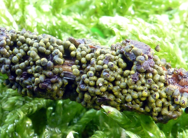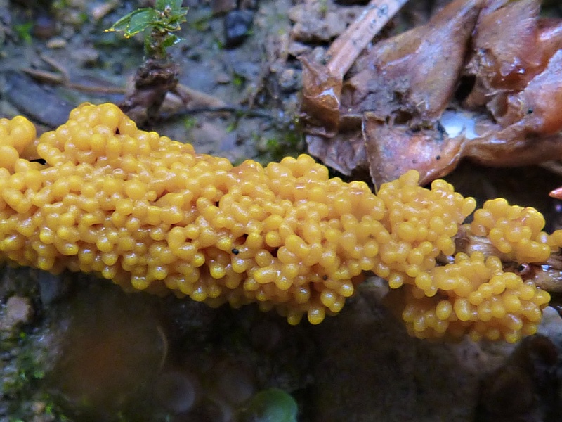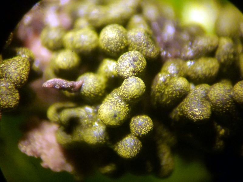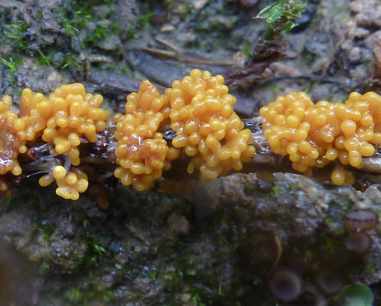 ohne die Mikromerkmale noch einmal verglichen zu haben: Dein Fund sollte auf den Namen Physarum virescens hören. Diese würstchenförmigen Sporocarpien mit gelbem Kalkgranulat (sieht man ja auch mikroskopisch sehr schön!) sind ein typisches makroskopisches Auftreten.