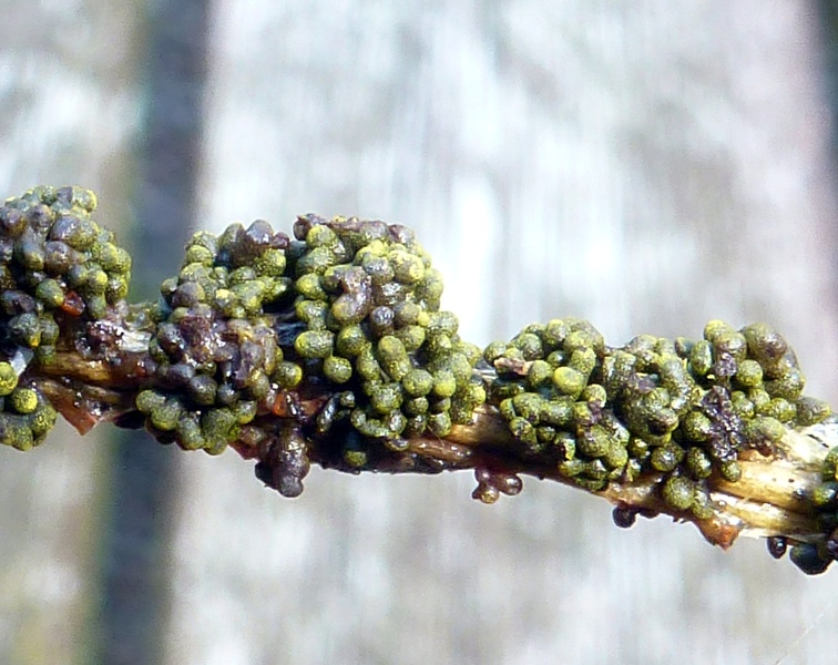 Heute war ich mit Beate unterwegs und diesen Fund hat sie gemacht. Ein im Feld noch sattgelber Schleimer auf dünnen Fichtenreisern. Einige Stunden später, zu Hause, hatten sie sich bereits dunkel grün-braun verfärbt. Scheinbar haben sich auch Algen darauf gebildet.