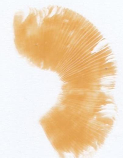 Hut : bis 4,5cm breit , ockergelb , zwischen Rand und Mitte konzentrisch etwas rötlicher Beiton. Huthaut komplett abziehbar , unter Huthaut weiß.Lamellen : Blassocker , sehr dicht , einige wenige zum Rand hin gegabelt , keine Lamelletten.