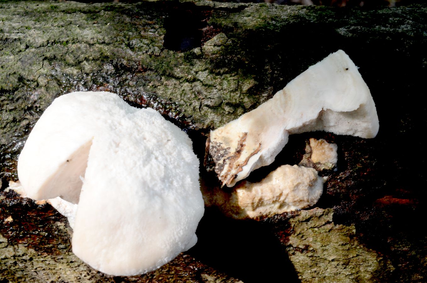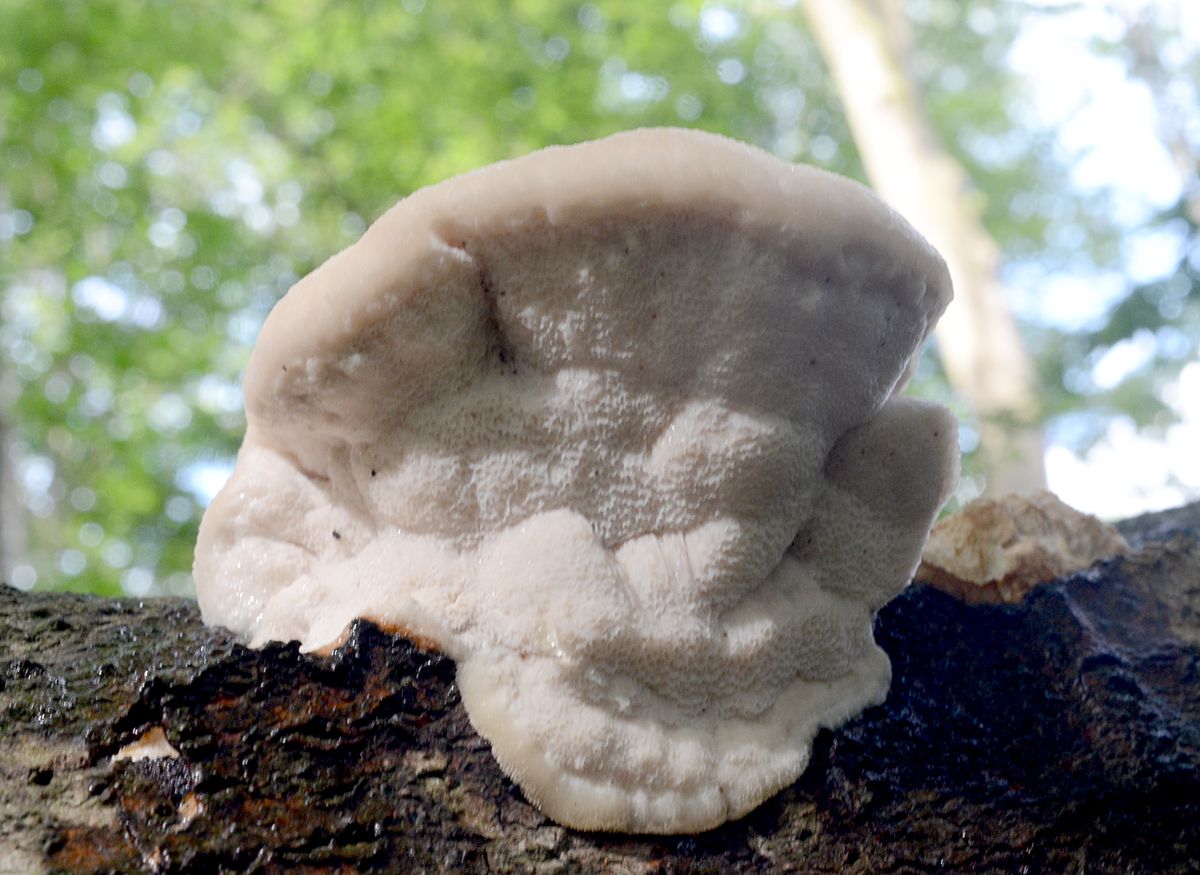 Dein Pilz schaut eher nach einem Saftporling (Oligoporus) aus, Peter. An Laubholz müsste man erstmal beherzt reinbeißen, der Bittere (Oligoporus stipticus) kann auch mal an Laubholz auftauchen. Wenn er mild ist, gibt es außer der Reaktion auf Schwefelsäure keine Möglichkeit, Oligoporus tephroleucus und Tyromyces chioneus makroskopisch sicher zu trennen.