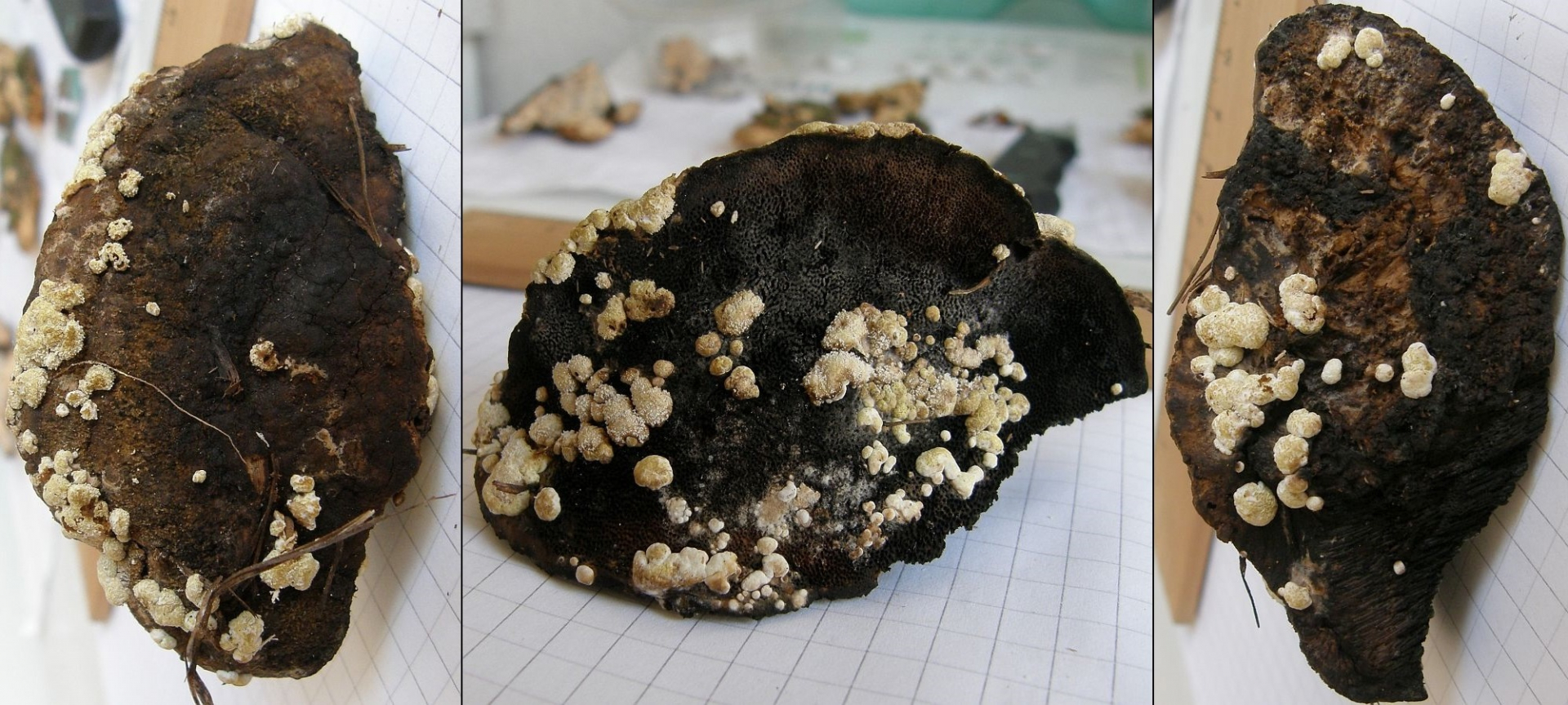Und vom Sonntag eine Kollektoin von Hypocrea pulvinata (Porlings - Kissenpustelpilz) auf einem unbekannten Porling, den ich auch nicht mehr bestimmen kann, außer daß ich weiß, daß es keine Phellinus - Mumie ist: